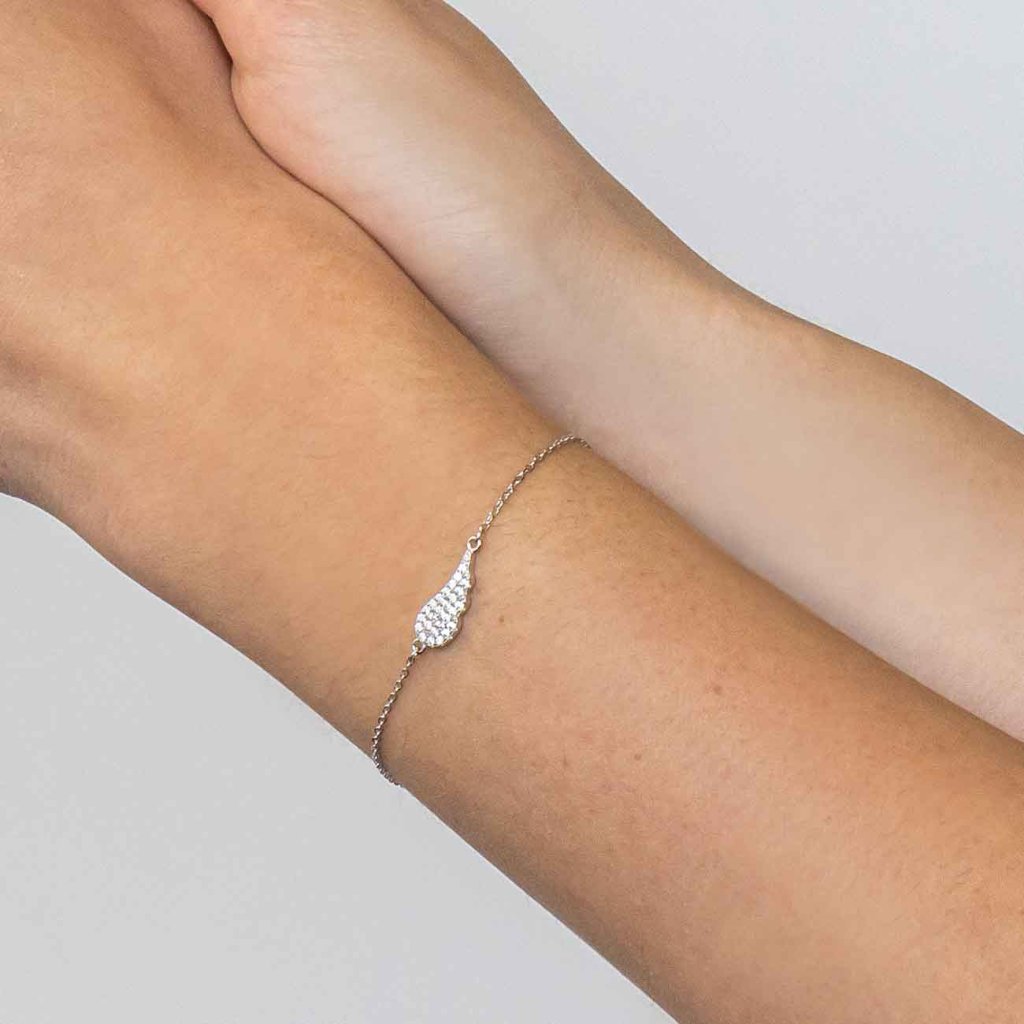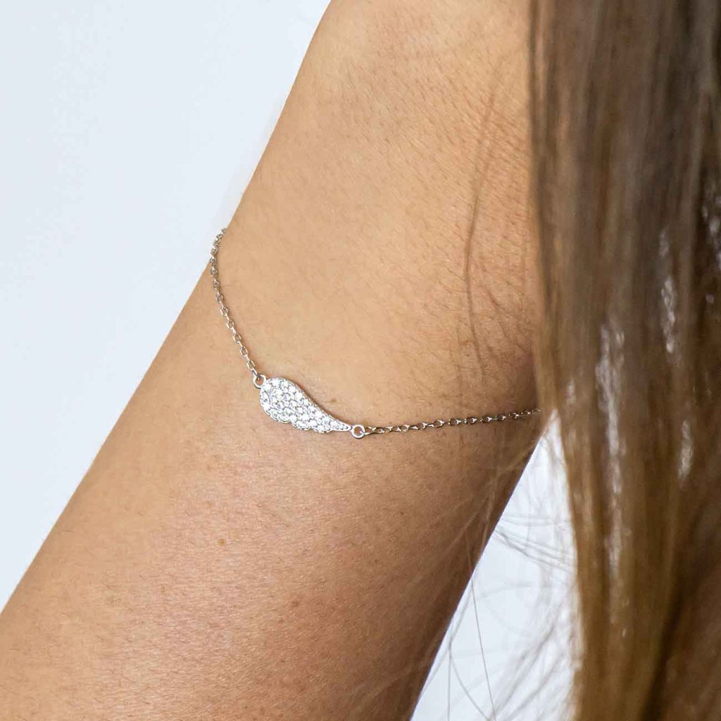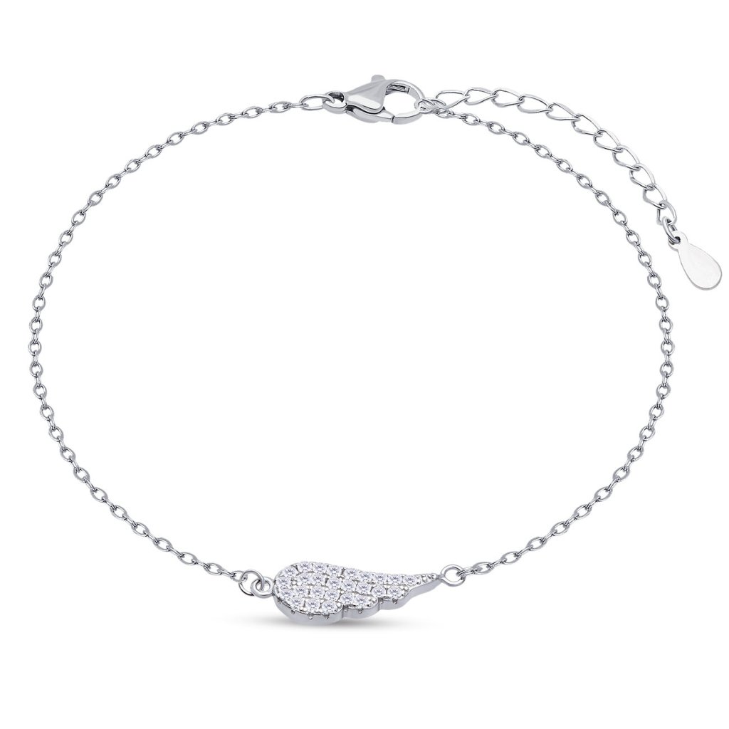 A finom lánccal és angyalszárny alakú medállal ellátott karkötő a védelem, a hit és a lét könnyedségének szimbóluma. A csillogó cirkónia elegáns fényt kölcsönöz az ékszernek, amely minden mozdulatnál magával ragadó. Ideális ajándék szerelemből vagy amulett a szerencséért.