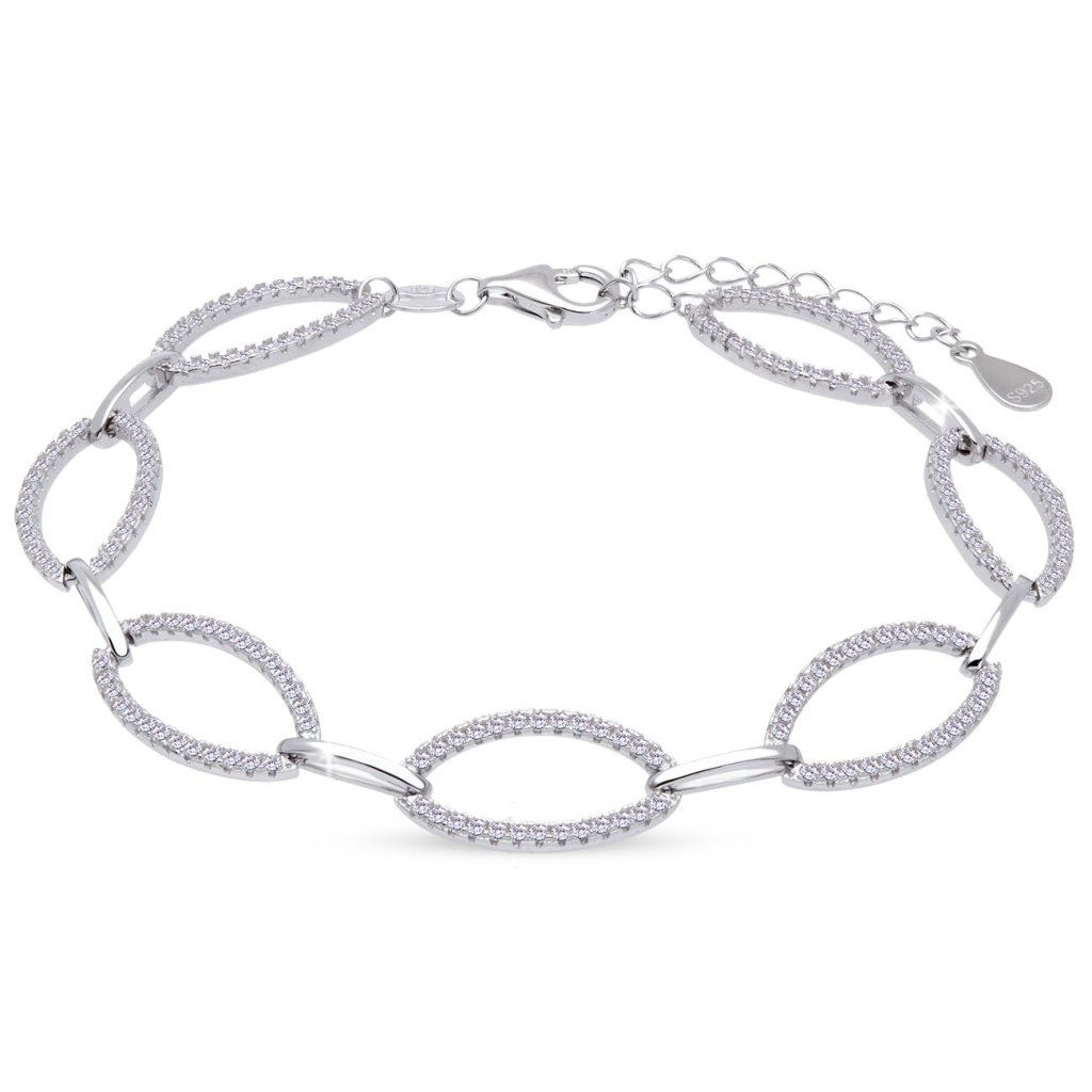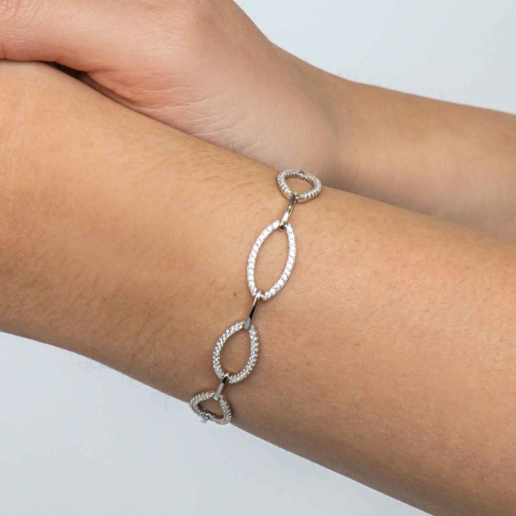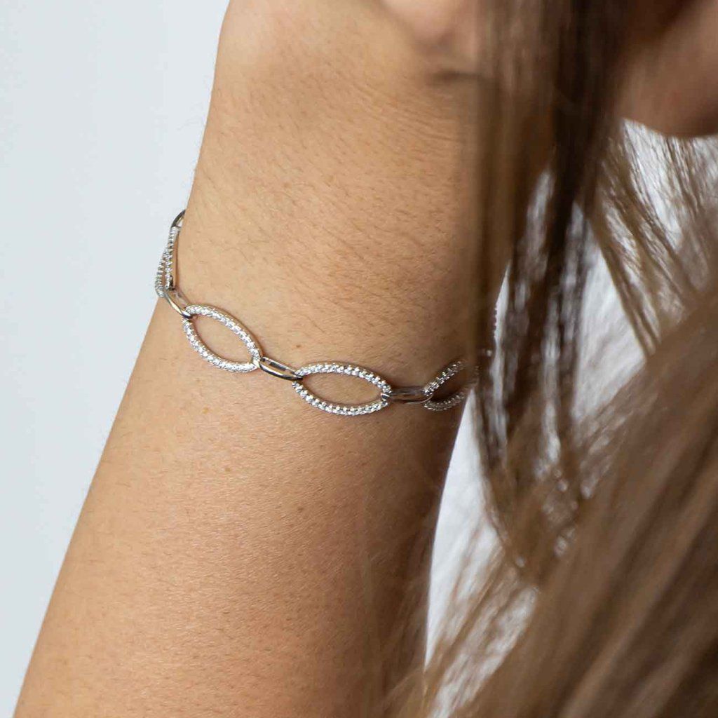 Elegáns karkötő fényes, ovális szemekből, melyek közül néhányat áttetsző cirkónia díszít. Kifejező ékszer finom csillogással, amely minden alkalommal díszíti a csuklót.