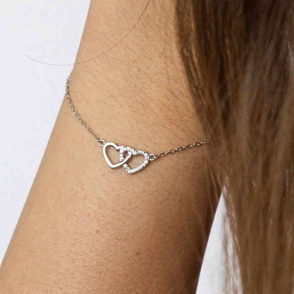 Finom ezüst karkötő két összekapcsolódó szív motívummal, melyek közül az egyik tiszta cirkóniákkal van kirakva. Romantikus ékszer, amely a szeretetet, a közelséget és az összetartozást szimbolizálja.