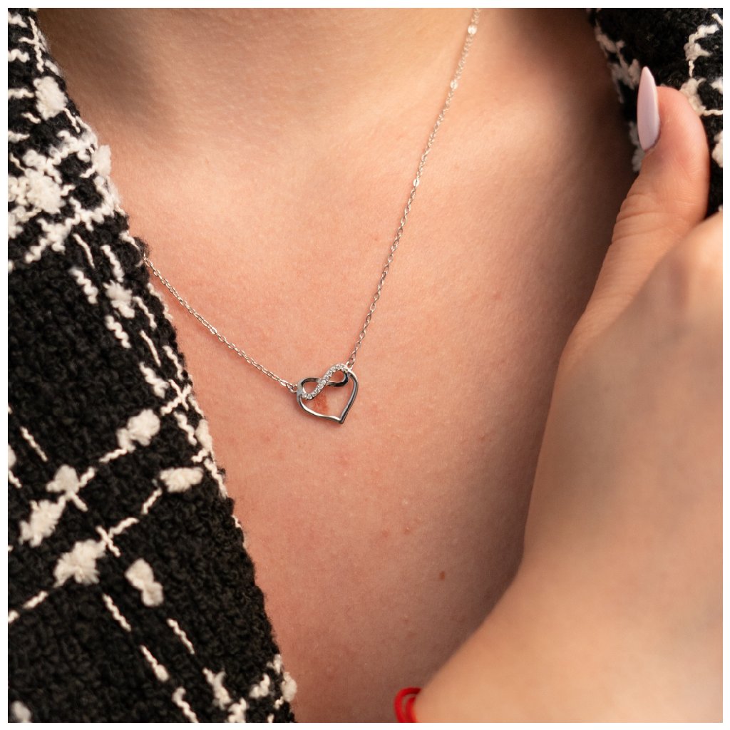 Fedezze fel az időtlen elegancia varázsát ezzel a finom ezüst nyaklánccal, amely az örökkévalóság és a szív szimbólumát egyesíti egy harmonikus egésszé. A minimalista dizájnt áttetsző, csillogó kövek emelik ki, amelyek egy fekvő nyolcas alakjában vannak elhelyezve, ami az örökkévalóságot szimbolizálja, míg a nyitott szív a végtelen szeretetet, odaadást vagy barátságot jelképezi.