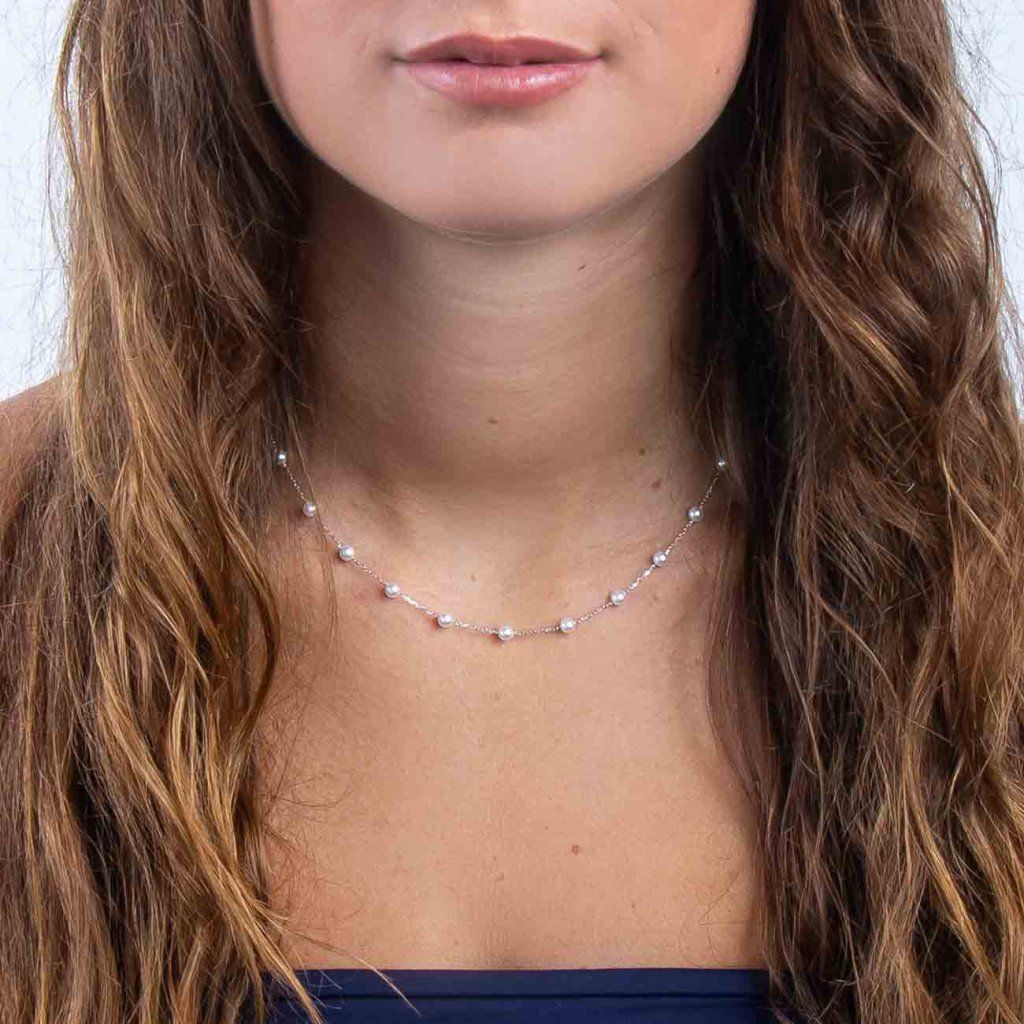 Ez a diszkrét ezüst nyaklánc rendszeresen elhelyezett gyöngyökkel gyengédnek és kifinomultnak tűnik. Ötvözi a gyöngyök finomságát és tisztaságát az ezüst finom csillogásával, harmonikus egészet alkotva, amely ideális mindennapi viseletre, mind ünnepi alkalmakra. Remekül illik más gyöngyös kiegészítőkhöz.