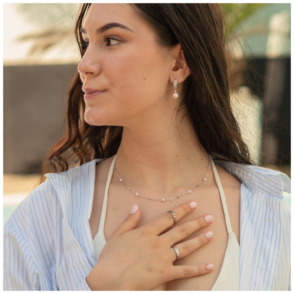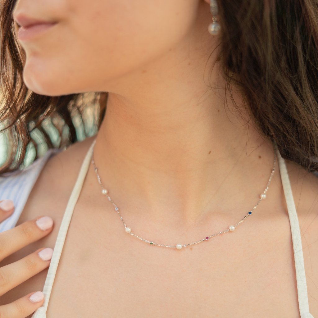 Elegáns ezüst nyaklánc, amely ötvözi a gyöngyök klasszikus szépségét a színes cirkóniák játékos csillogásával. A kisebb kövek kék, rózsaszín, zöld és lila árnyalataiban finoman kontrasztos egészet alkotnak, amely frissnek és eredetinek tűnik. Ideális azoknak a nőknek, akik szeretik a visszafogott ékszereket, egyedi érintéssel.
