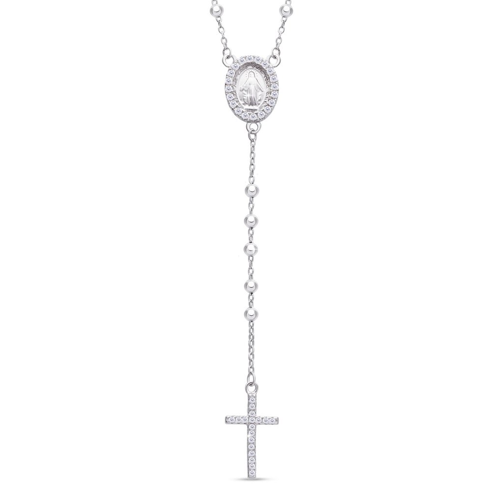 Elegáns rózsafüzér stílusú nyaklánc finom cirkóniákkal díszítve, Szűz Mária ábrázolású medállal és kereszttel. A hit, a szimbolika és a finom ékszerkészítés kombinációja – ideális személyes talizmánként vagy értékes spirituális ajándékként.