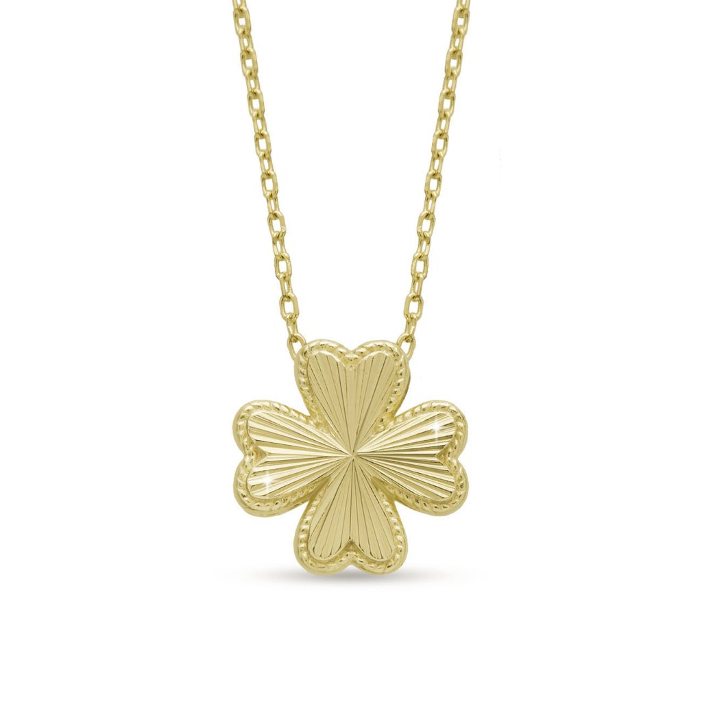 Aranyozott lánc 925/1000-es ezüstből készült finom, négylevelű lóhere alakú medállal, amely precízen, vésett, sugárirányú mintával van díszítve. Minden levél alakja szív, ami romantikus és játékos jelleget kölcsönöz az ékszernek. A felület részletei gyönyörűen csillognak, és mélyebb struktúra hatását keltik.
