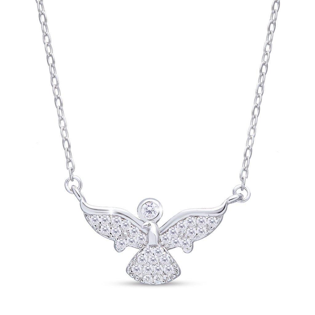 Finom ezüst nyaklánc angyal medállal, amely a védelmet, a hitet és a nyugalmat szimbolizálja. Az angyalka teste és szárnyai tiszta cirkóniával vannak kirakva, amelyek finom fényt és bájt kölcsönöznek az ékszernek. Ideális ajándék minden alkalomra – a születésnaptól a jelentős életeseményekig.