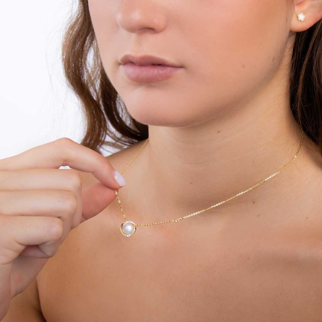 Elegáns nyaklánc valódi Ag 925/1000 ezüstből, 14 karátos arannyal bevonva, egyesíti a gyöngy szépségét a tiszta cirkónia kövek ragyogásával egy harmonikus, kerek formában. A finom részlet a láncon lágyságot és eredetiséget kölcsönöz az egész ékszernek. Stílusos kiegészítő a mindennapi eleganciához és a különleges pillanatokhoz.