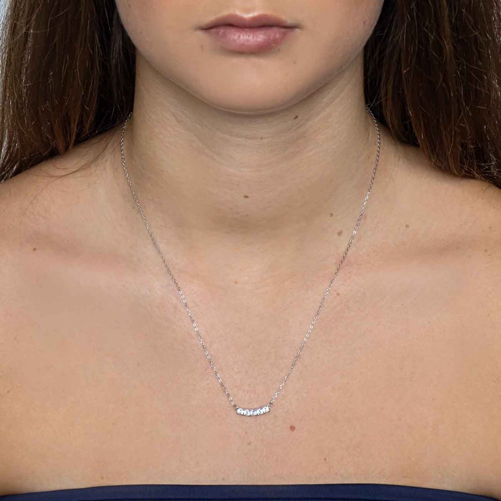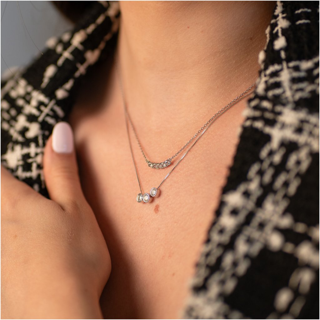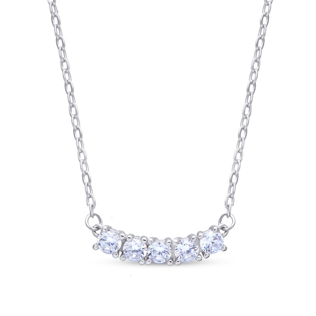 Elegáns és időtálló – ez a finom Ag 925/1000 ezüstből készült nyaklánc, amelyet öt tiszta cirkónia díszít egyenes vonalban, tökéletes kiegészítő minden alkalomra.
