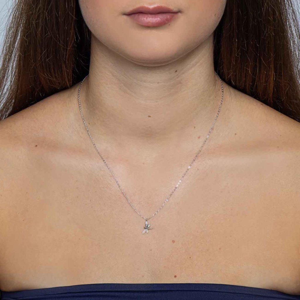 A szitakötő a könnyedség, a szabadság és a belső erő szimbóluma. Ez a finom ezüst nyaklánc szitakötő medállal csillogó, tiszta cirkóniákkal van díszítve, amelyek gyönyörűen fogják fel a fényt. Ideális ajándék azoknak a nőknek, akik szeretik a természetes motívumokat és az elegáns kiegészítőket. Remekül passzol romantikus és hétköznapi öltözékekhez is.