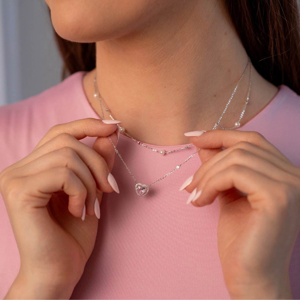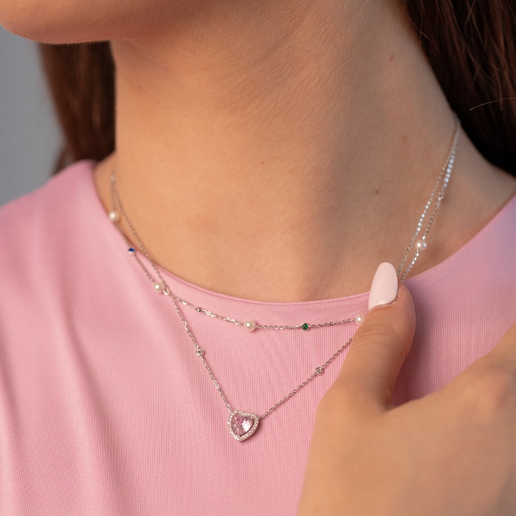 Burkolózzon eleganciába és finom fénybe ezzel a kivételes ezüst nyaklánccal 925/1000-es tisztaságú. A domináns elem egy ragyogó rózsaszín, briliáns csiszolású kővel díszített szív alakú medál, melyet finom, tiszta cirkóniák szegélyeznek körbe. További két cirkónia kő található a láncon. A lenyűgöző design ötvözi a luxus megjelenést egy romantikus érintéssel. Az eredmény egy feltűnő, mégis finom design, amely első pillantásra megragadja a figyelmet.