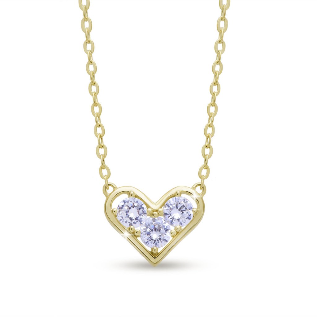 Az elegáns nyaklánc minőségi 925/1000 ezüstből készült, sárga arany bevonattal, amely meleg fényt és luxus megjelenést kölcsönöz neki. A szív alakú medál három finoman csiszolt, tiszta cirkóniával van kirakva, amelyek csillogást és egyediséget kölcsönöznek az ékszernek.