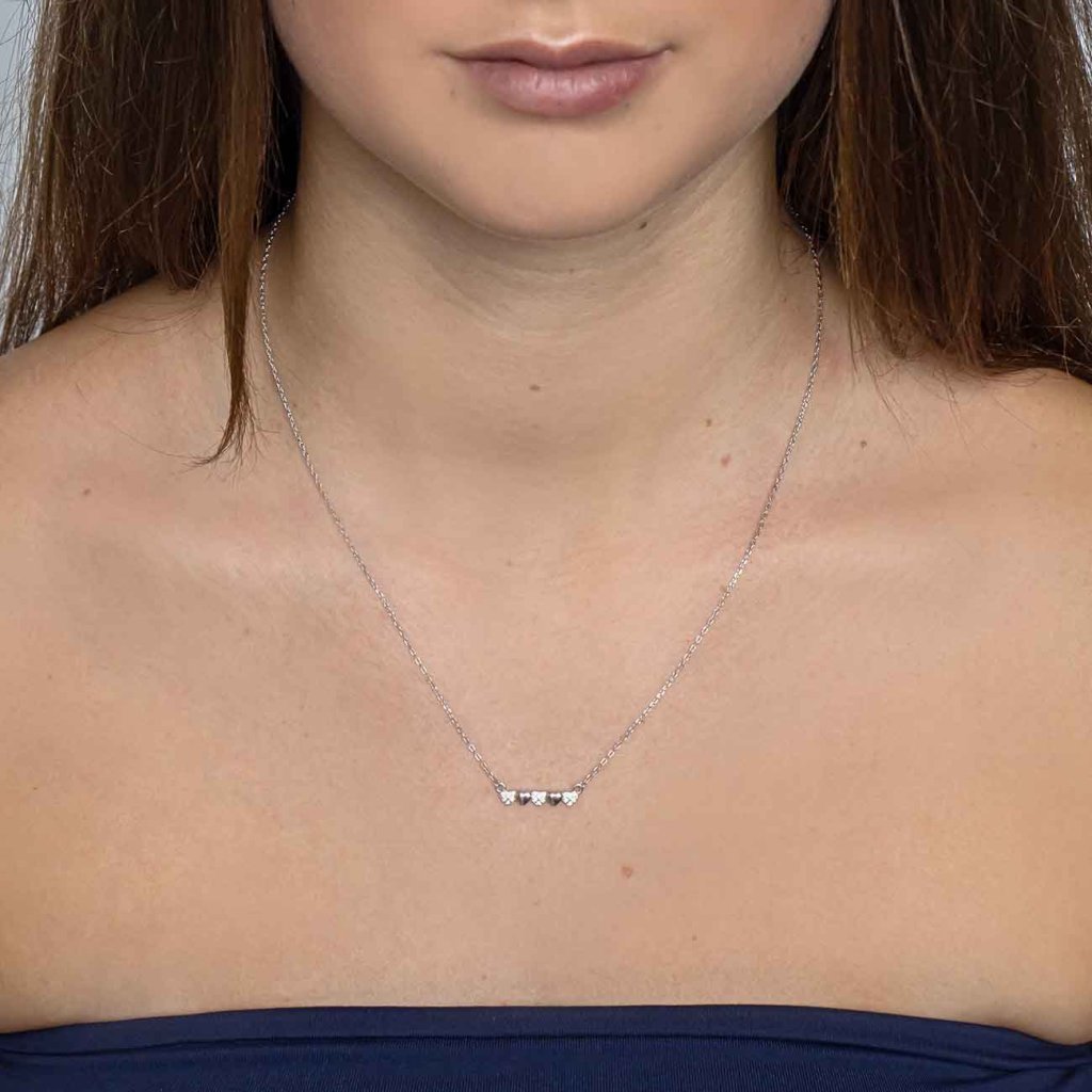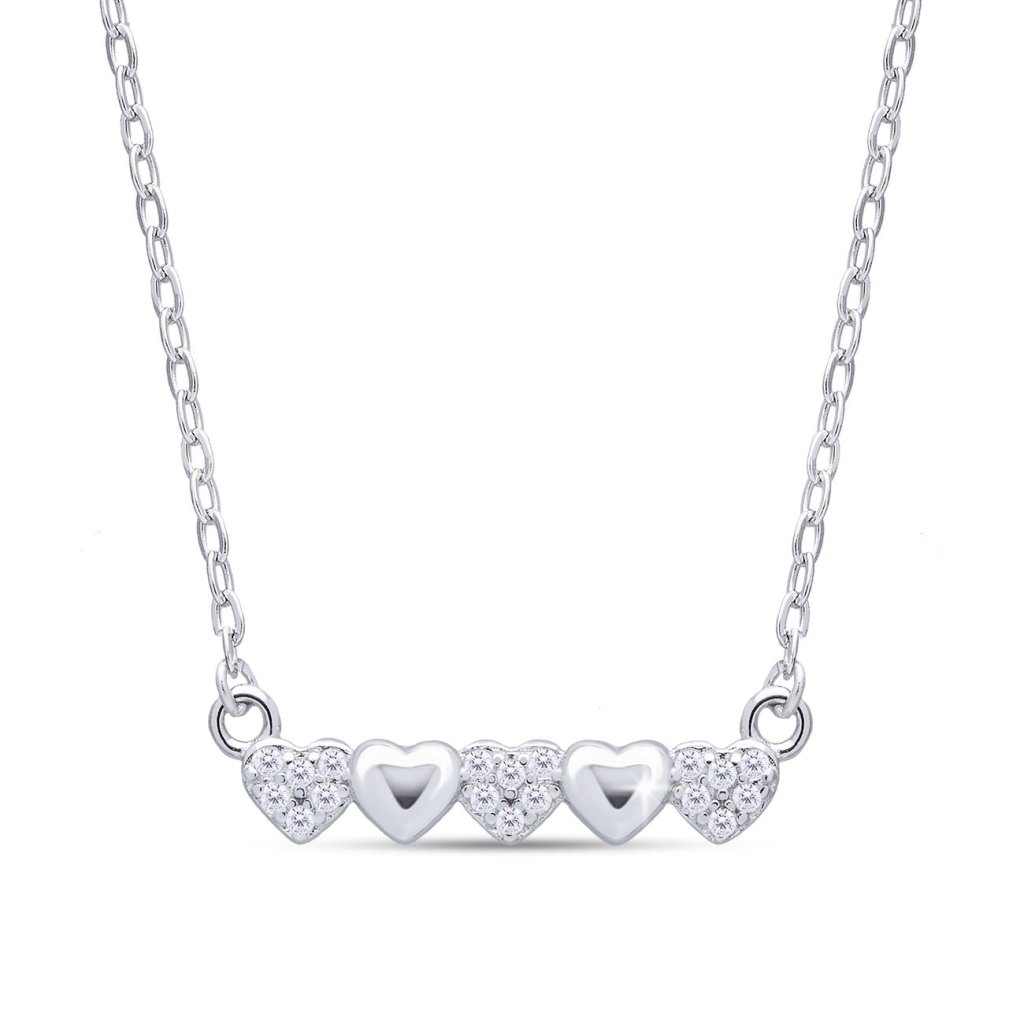 Öt kis szív – öt ok a szeretetre. Ez a finom Ag 925/1000 ezüstből készült nyaklánc felváltva fényes és cirkónia szívekkel van díszítve, amelyek a szeretetet, a barátságot és a gyengédséget szimbolizálják. Elegáns vonalai és finom csillogása tökéletes ékszerré teszik mindennapi viseletre és ünnepi alkalmakra egyaránt.