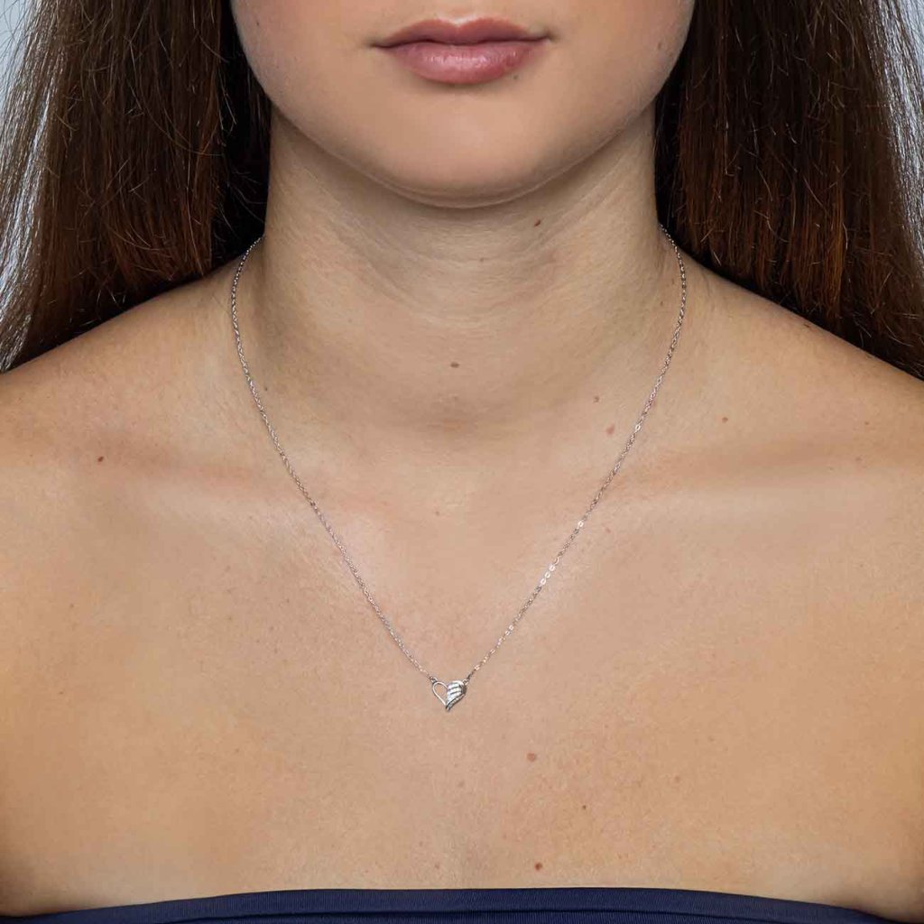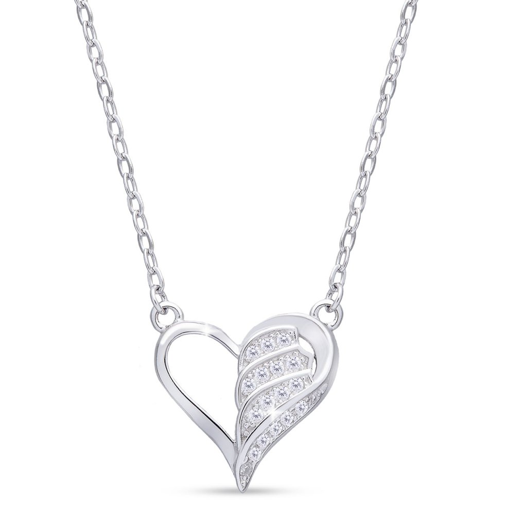 Ez a gyönyörű, Ag 925/1000 ezüstből készült nyaklánc egy szív alakot kombinál egy angyali szárny finom vonalával, amelyet csillogó cirkónia kövek díszítenek. A szeretetet, a védelmet és a spirituális kapcsolatot szimbolizálja – ideális ékszer mindenkinek, aki ki szeretné fejezni érzelmeit és háláját. A finom csillogás és az elegáns design minden öltözéket különlegessé tesz.