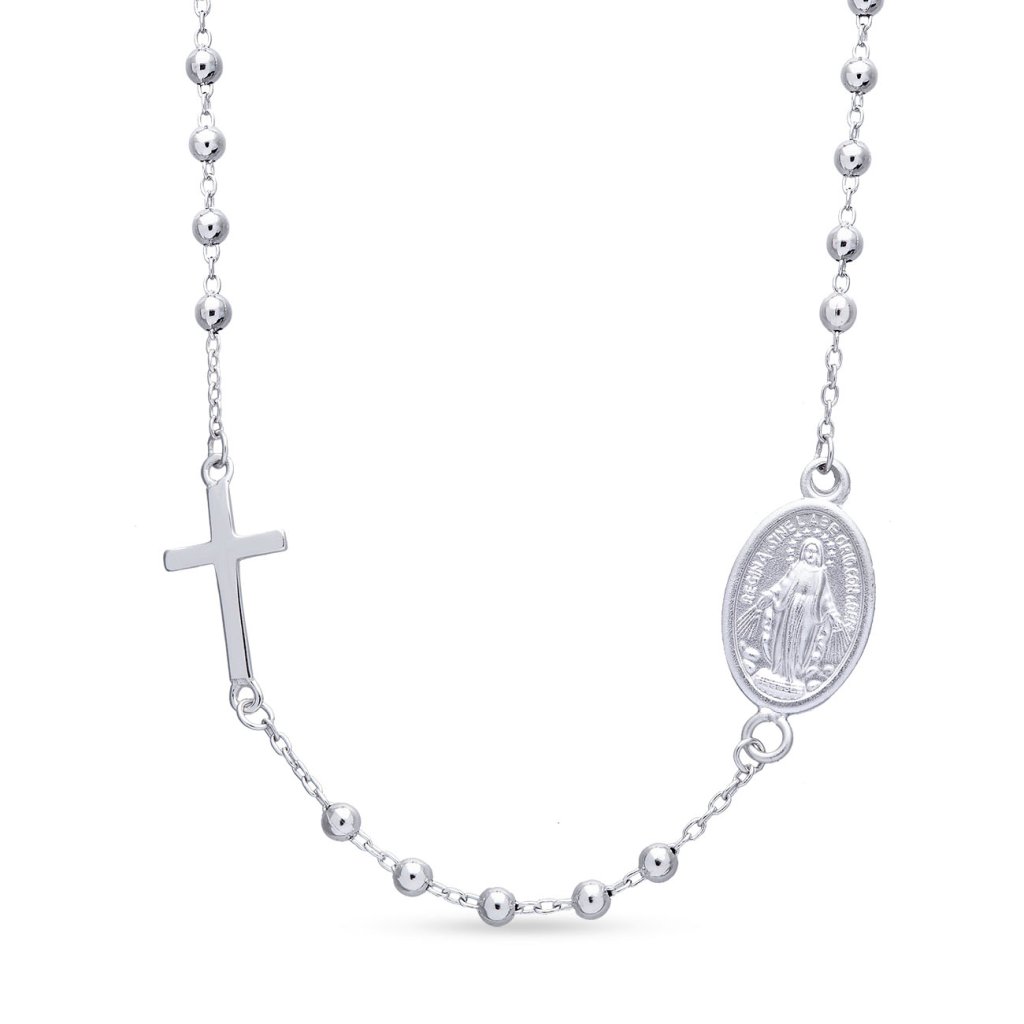 Ez a spirituális hangulatú Ag 925/1000 ezüstből készült nyaklánc a klasszikus rózsafüzér ihletésű, és összeköti a hitet az eleganciával. A finom, apró gyöngyökkel díszített nyakláncot egy diszkrét kereszt és egy ovális medál egészíti ki Krisztus alakjával. Ideális személyes amulettként, ajándékként vallási eseményekre vagy a hit stílusos kifejezéseként.
