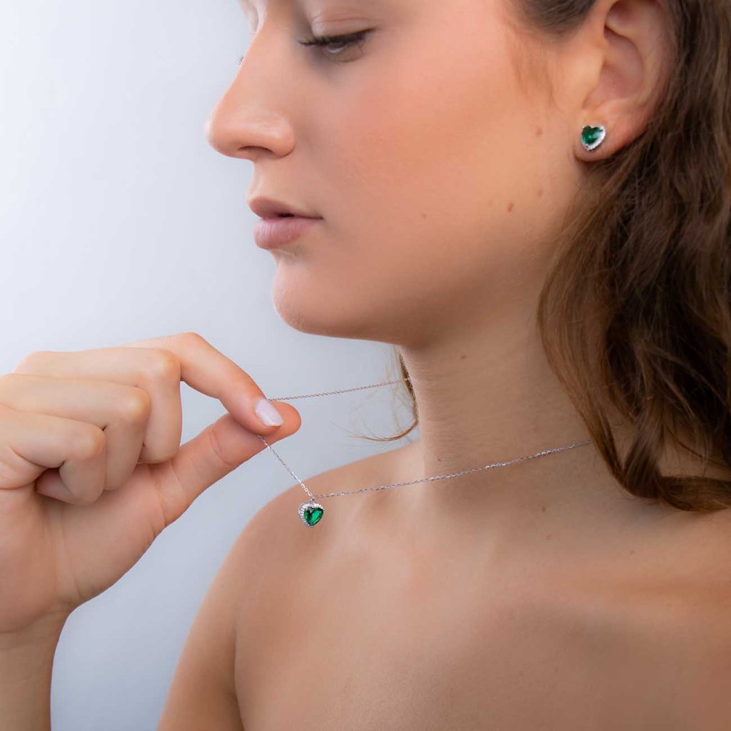Elbűvölő szett valódi Ag 925/1000 ezüstből, ragyogó zöld szívvel, melyet csillogó, tiszta cirkóniák szegélyeznek, az elegancia és a finom romantika szimbóluma. A precíz csiszolás mélységet és elevenséget kölcsönöz a kőnek, míg a szív alakú forma hangsúlyos karaktert kölcsönöz az ékszernek. Ideális ajándék szerelemből, vagy lenyűgöző kiegészítő ünnepi pillanatokra.