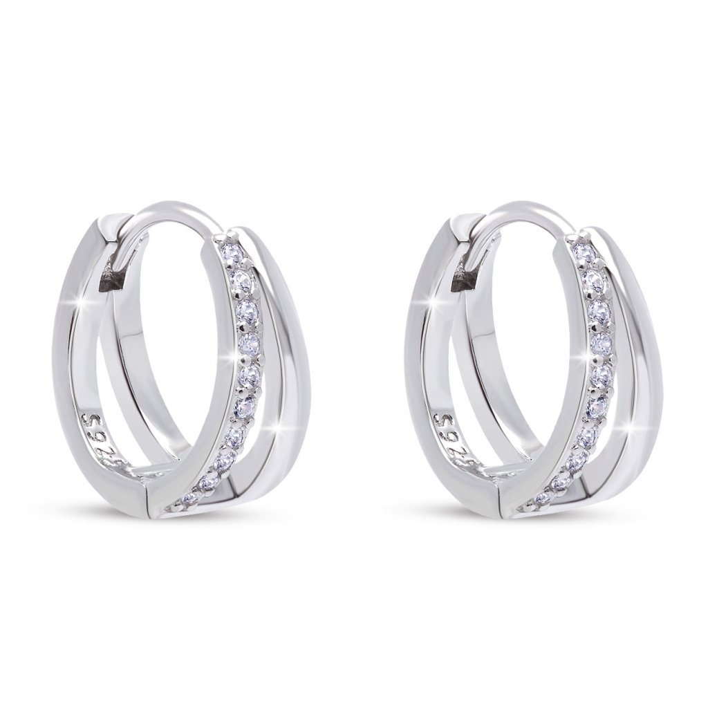 A modern és elegáns, Ag 925/1000 minőségű ezüstből készült fülbevalók szokatlan, keresztezett formájukkal és a csillogó, tiszta cirkónia vonalukkal hódítanak. A kétsoros kialakítás luxus megjelenést kölcsönöz az ékszernek, amely tökéletesen kiegészíti a nappali és az esti öltözéket egyaránt. A kényelmes záródásnak köszönhetően könnyen felhelyezhető és kiválóan tart a fülben.