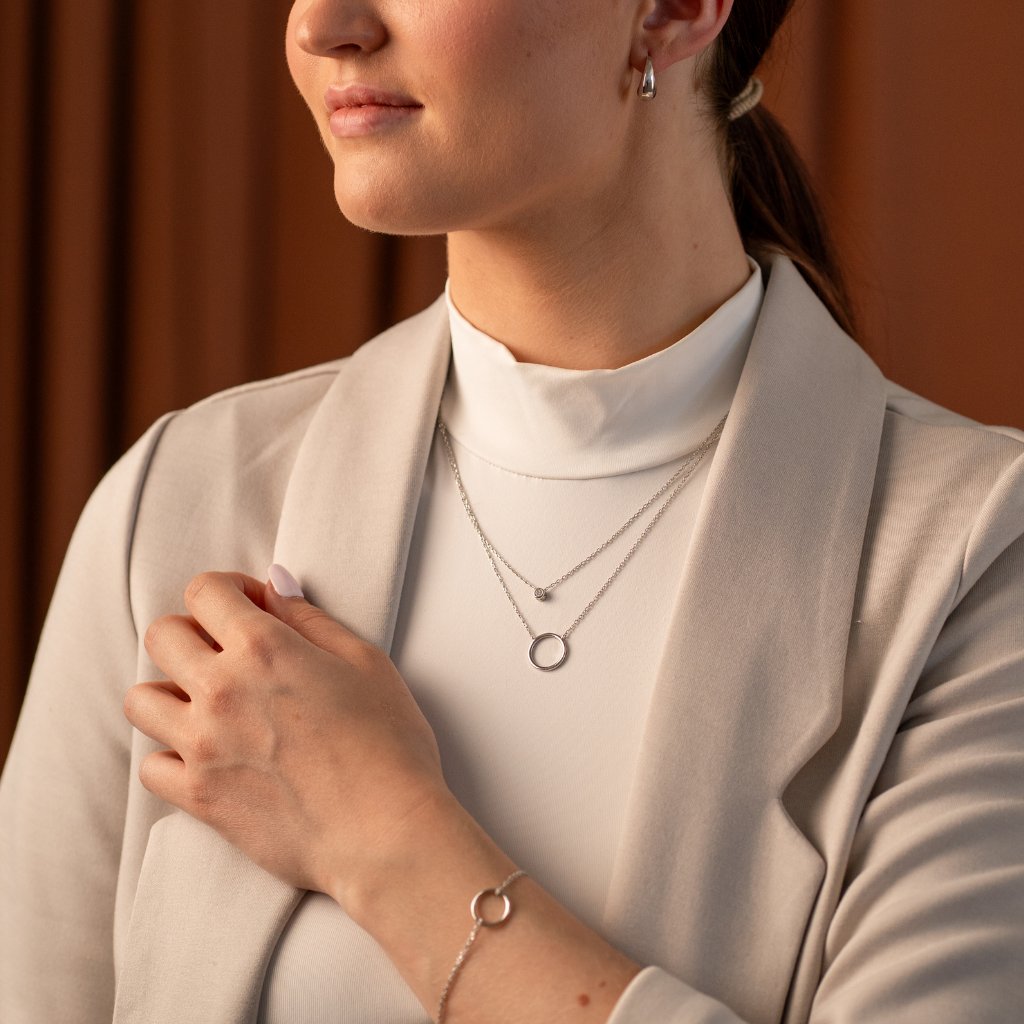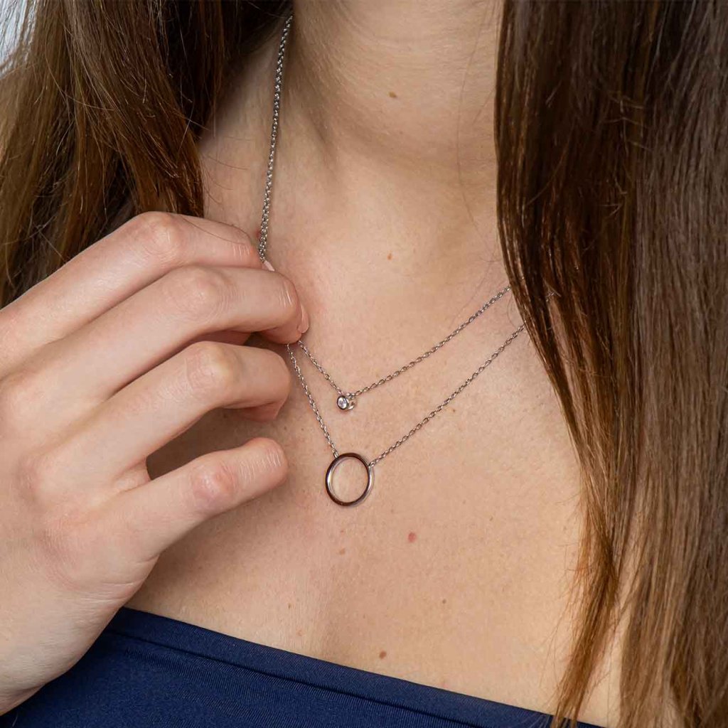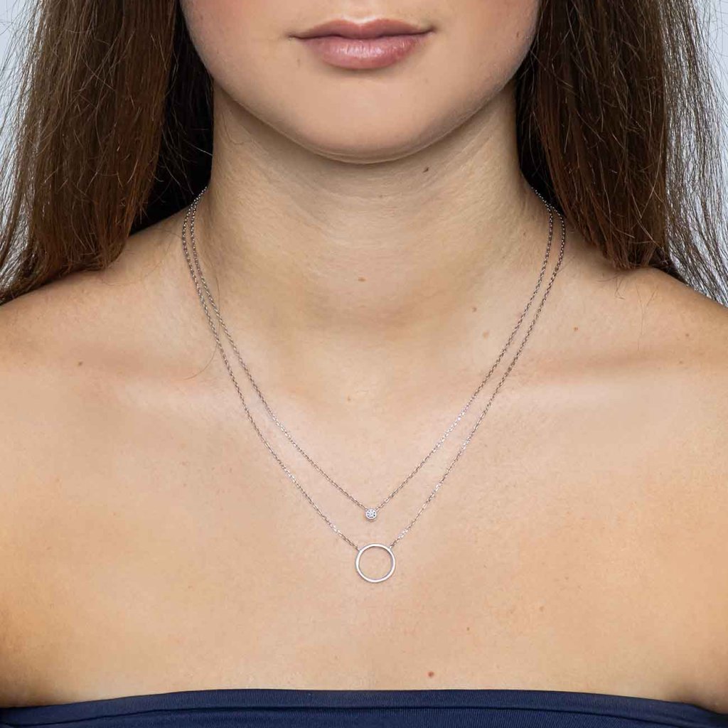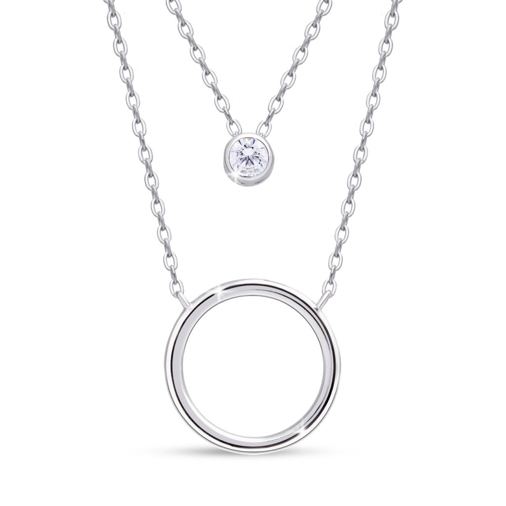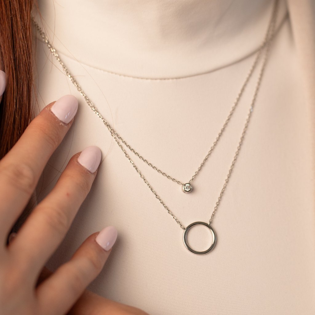 Modern kétsoros nyaklánc, amely finom, tiszta cirkóniát és minimalista kör alakú medált kombinál. Elegáns, rétegzett design, amely önmagában is viselhető, vagy más ékszerekkel kombinálható.