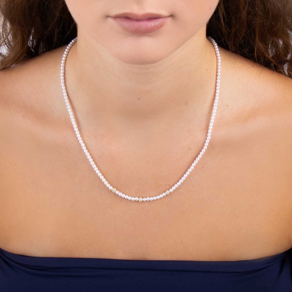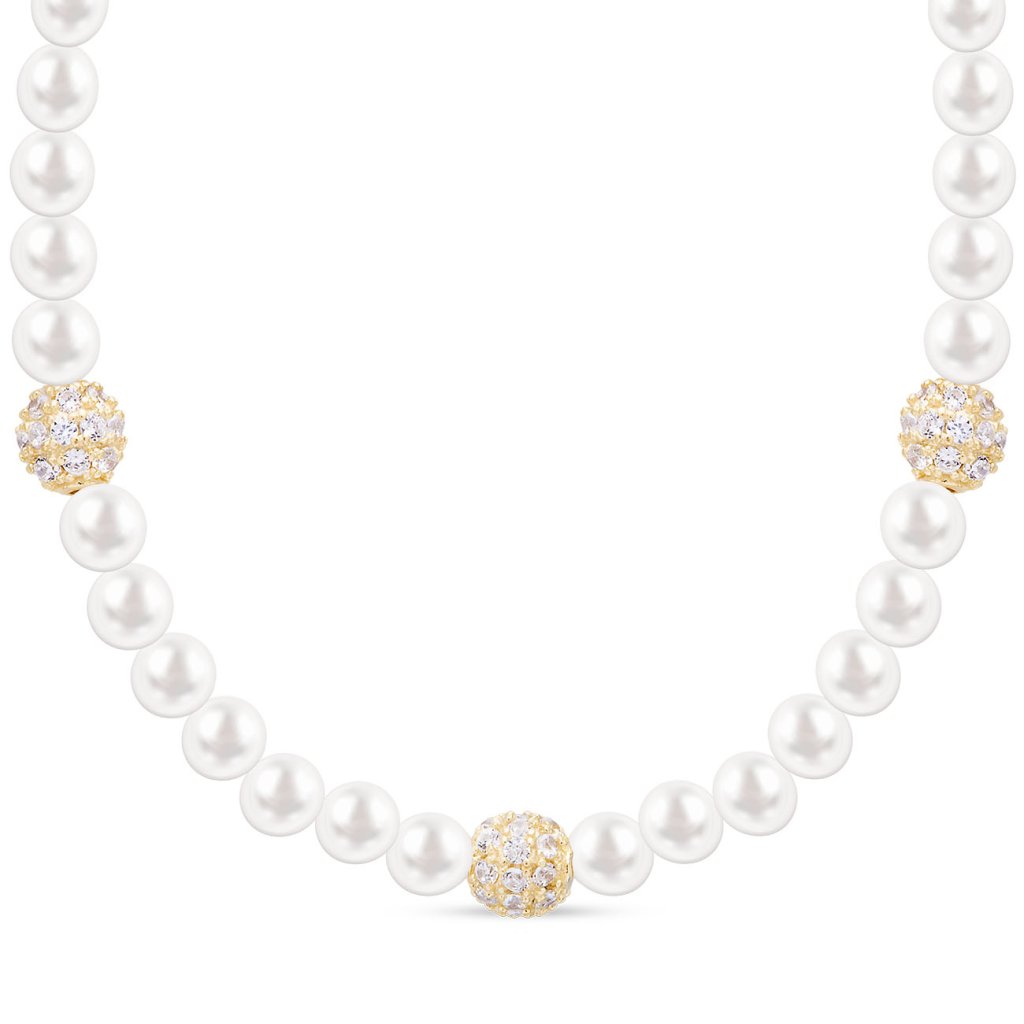 A valódi Ag 925/1000 ezüstből készült gyöngy nyaklánc finomságával és kidolgozott részleteivel hívja fel magára a figyelmet. A szabályosan felfűzött gyöngyöket három dekoratív, 14 karátos arannyal bevont gömb egészíti ki, amelyeket tiszta cirkónia kövek díszítenek, ünnepi jelleget kölcsönözve az ékszernek. A gyöngyök és az aranyozott elemek időtlen kombinációja ideális különleges alkalmakra és elegáns hétköznapi viseletre egyaránt.