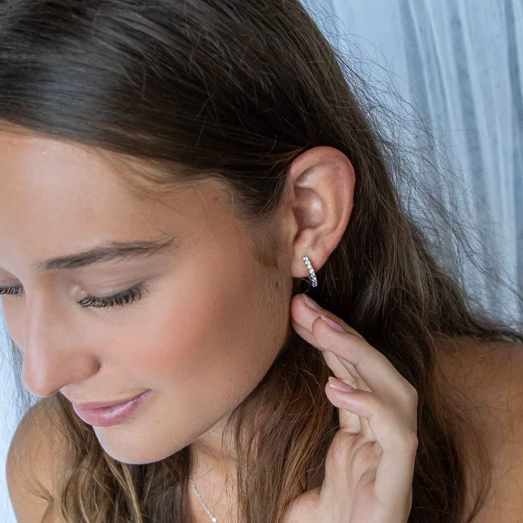 Klasszikus, nemes fényű – ezek a karika fülbevalók számos tiszta cirkóniával vannak kirakva, amelyek gyönyörűen tükrözik a fényt és csillogó hatást kölcsönöznek az ékszernek. Decens és időtlen kialakításának köszönhetően bármilyen öltözékhez illik – a hétköznapitól az ünnepiig.