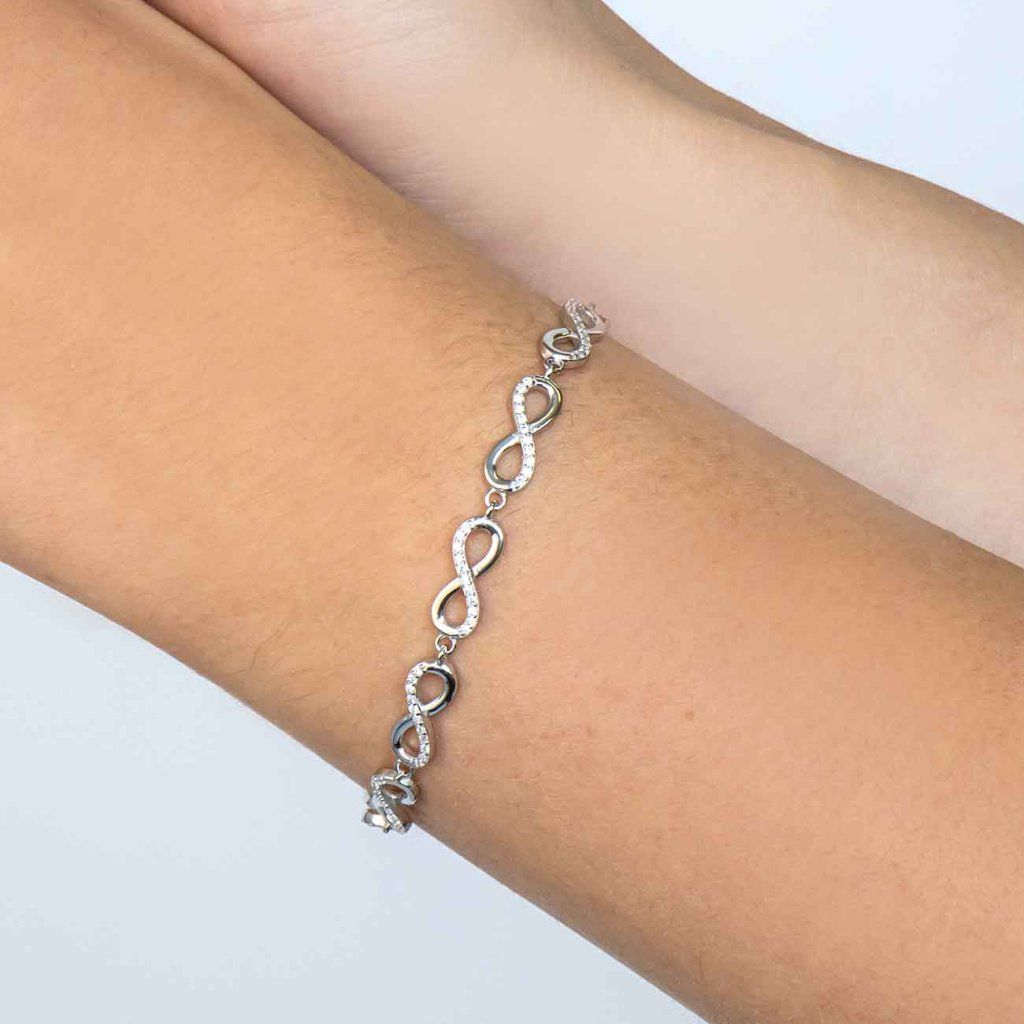 A káprázatos karkötő, melyet finom cirkóniákkal díszített, összefonódó végtelen szimbólumok alkotnak, a végtelen szerelmet, odaadást és reményt testesíti meg. A precíz kidolgozás és a ragyogó fény teszi különleges kiegészítővé minden nő számára, aki eleganciára és mélyebb jelentésre vágyik.