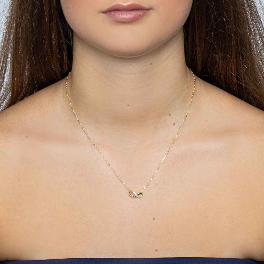 Elegáns, minőségi 925/1000 ezüstből készült, aranyozott felületű láncon egy végtelen jelet formázó medál található, melyet csillogó, tiszta cirkónia kövek díszítenek. A végtelen szimbólum az örökkévalóságot, az egyensúlyt és a soha véget nem érő szerelmet jelképezi – ezért ez az ékszer népszerű ajándék a partnernek, édesanyának vagy egy közeli barátnak.