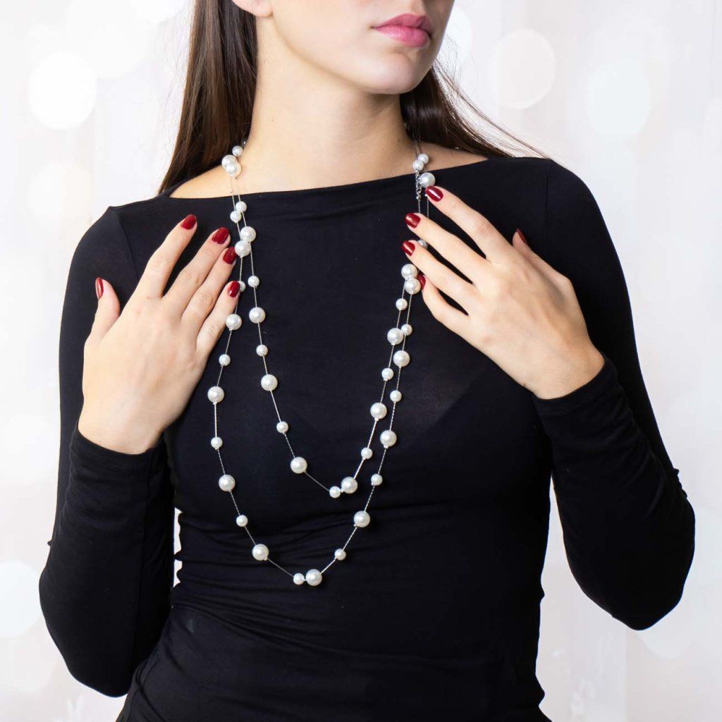 Ezüstszínű láncon lévő, különböző méretű gyöngyökkel díszített, modern, luxus kétsoros nyaklánc tökéletes kiegészítője egy elegáns nőnek. A kisebb és nagyobb gyöngyök kombinációja harmonikus és nagyon látványos dizájnt hoz létre, amely első pillantásra megragadja a figyelmet. Ideális ünnepi eseményekre, bálokra vagy egyszerű ruhákhoz feltűnő ékszerként.