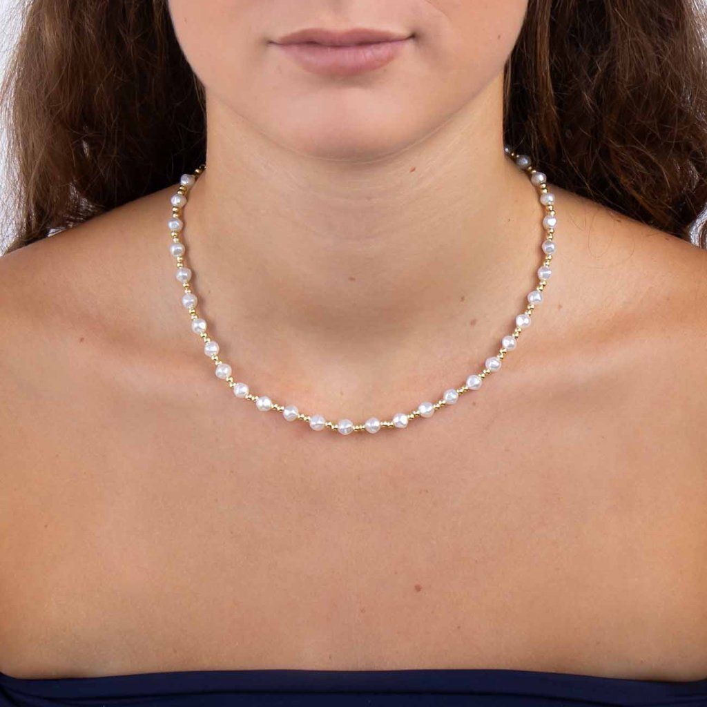 Az elegáns, modern gyöngy nyaklánc a szabálytalan fehér gyöngyök és a fényes arany gyöngyök kombinációjával hódít. Az ékszer luxus hatást kelt, ugyanakkor természetes és friss. A 14 karátos aranyozásnak és a gyöngyök enyhén aszimmetrikus formájának köszönhetően ideális azoknak a nőknek, akik szeretik az eredeti, de finom kiegészítőket.