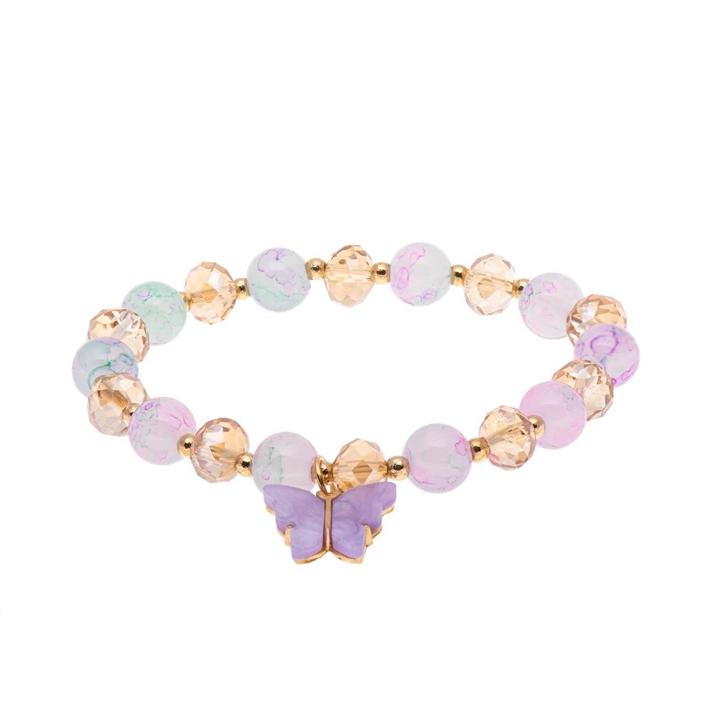 Gyönyörű, rugalmas karkötő csiszolt és márványozott üveggyöngyök kombinációjából, amelyek gyönyörűen csillognak és játszanak a színekkel. A karkötő domináns eleme egy középső elem – egy fém pillangó színes zománccal. Stílusos kiegészítő a mindennapi viselethez és aranyos ajándék is egyben.