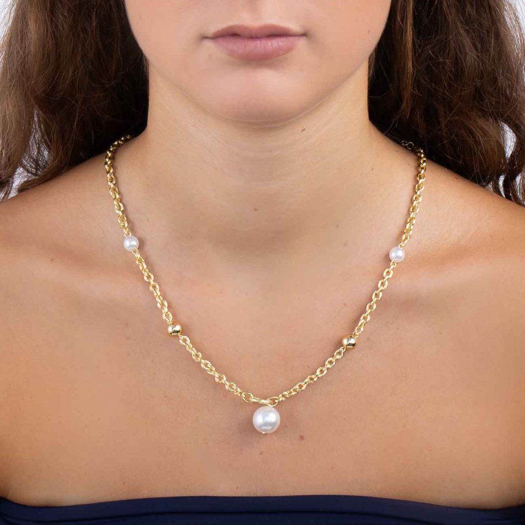 A finom és elegáns, fényes arany tónusú nyaklánc a fémgolyók és gyöngyök visszafogott kombinációjával hívja fel magára a figyelmet. A domináns elem egy hangsúlyos fehér gyöngyös medál, amely egy finom textúrájú, kör alakú részletre van akasztva. A 14 karátos aranyozásnak és a kifinomult megjelenésnek köszönhetően ez az ékszer ideális mindennapi viseletre és ünnepi alkalmakra is.