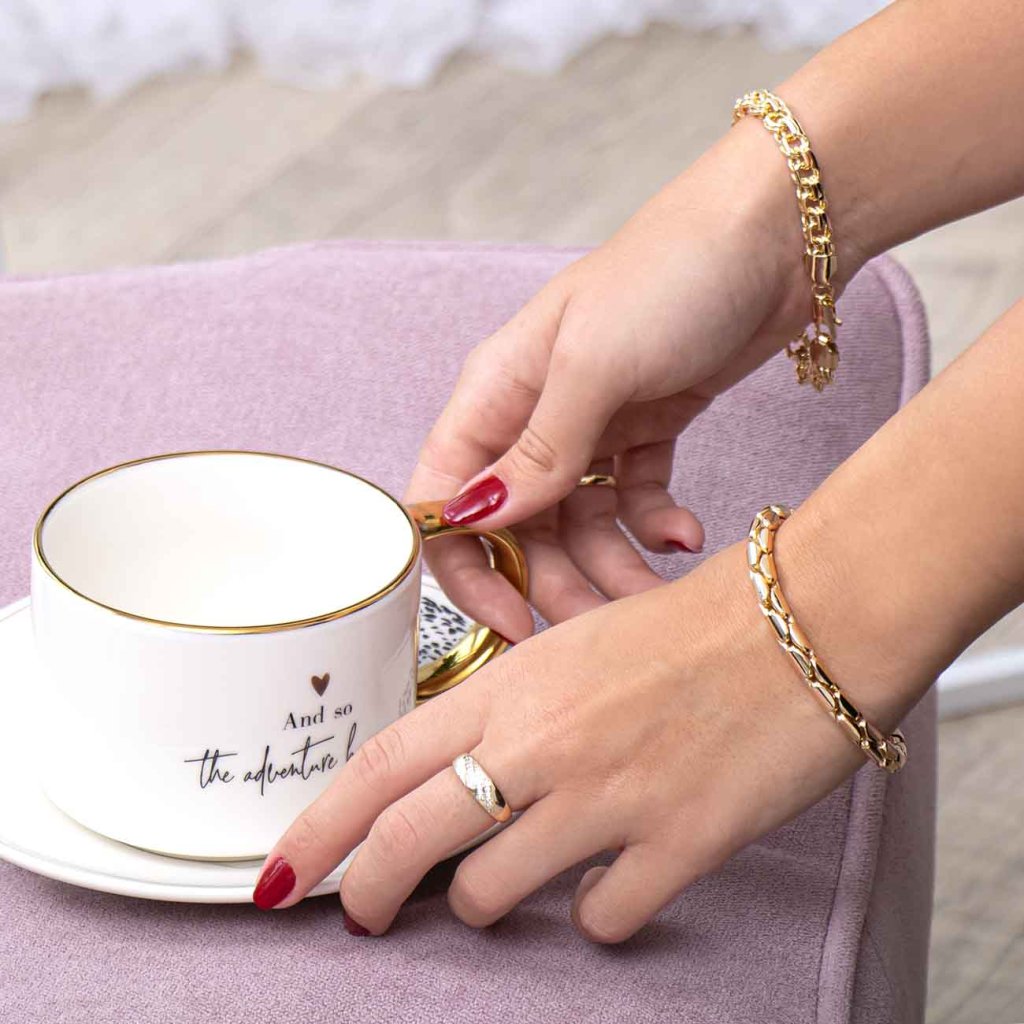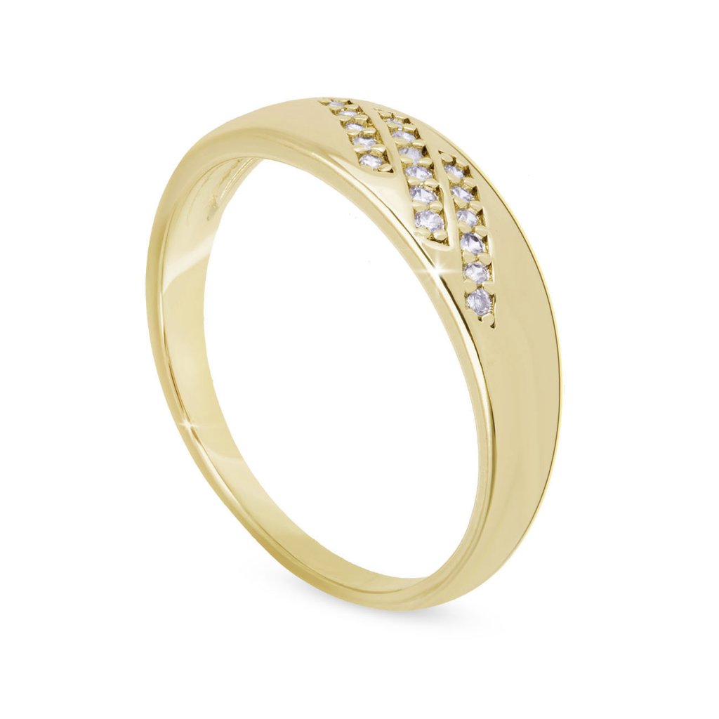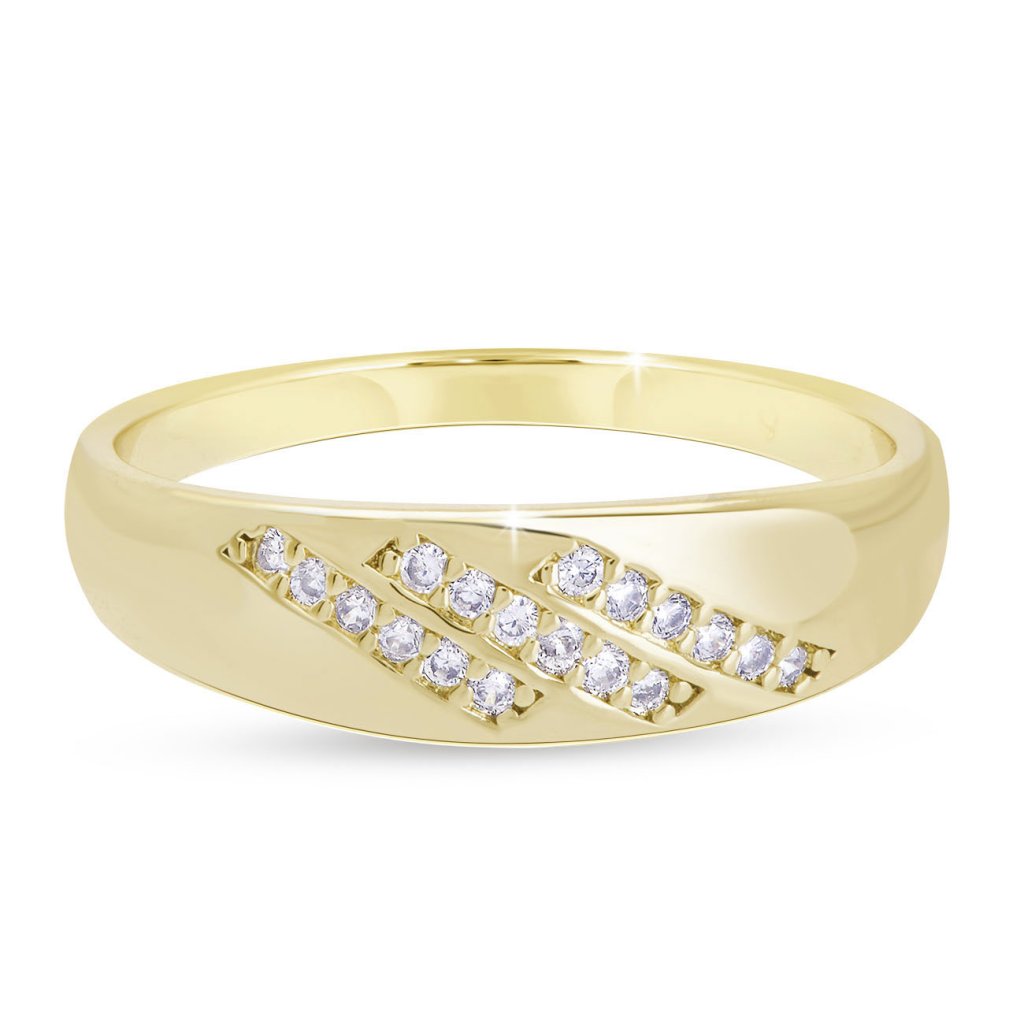 Egyszerű, mégis rendkívül elegáns gyűrű, amely elbűvöl finom díszítésével. A három, apró cirkóniákkal kirakott ferde vonal finom fényt kölcsönöz a sima, aranyozott felületnek. Minimalista dizájnja ideális kiegészítővé teszi mindennapi viseletre és ünnepi alkalmakra egyaránt.