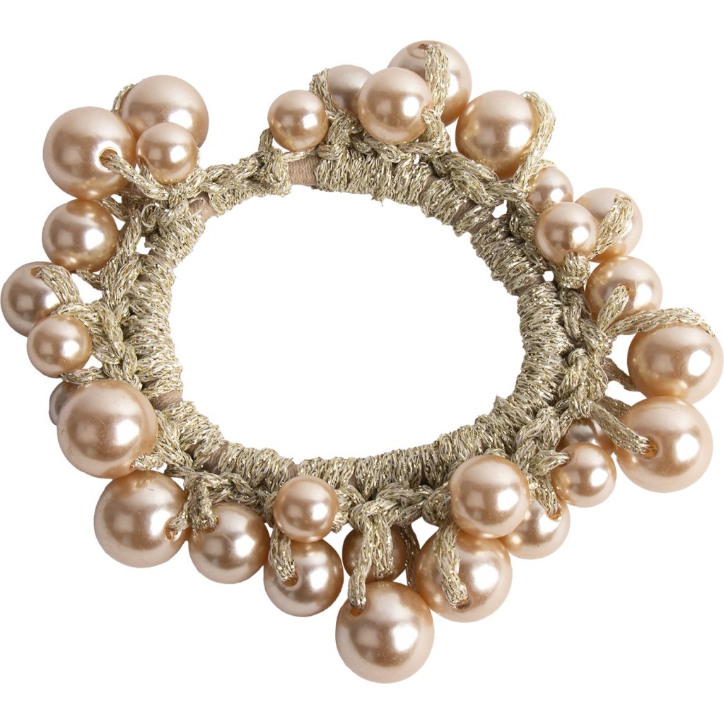 Vastag gumiszalag, különböző méretű gyöngyökkel díszítve. A gumipánt jól tartja a durva és a finom hajat.