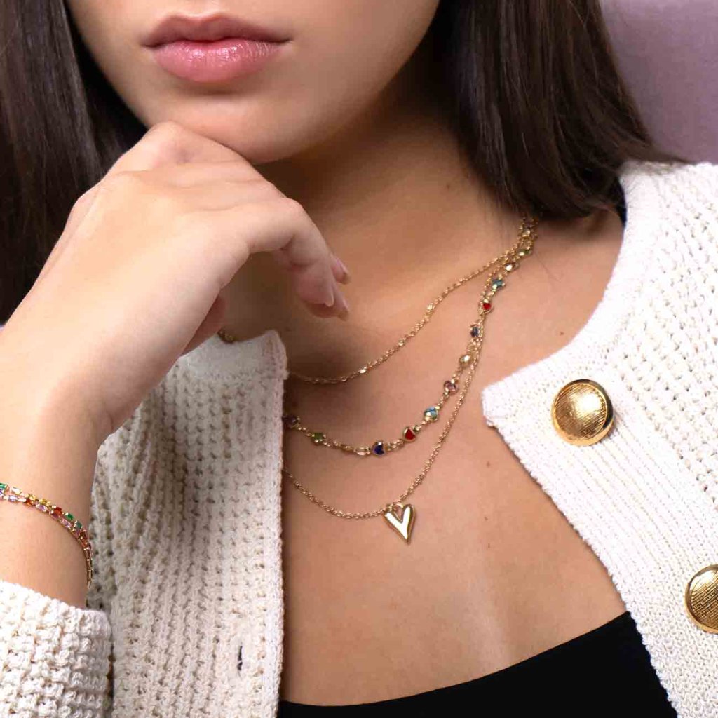 A romantikus, hármas nyaklánc a gyengédséget és a játékosságot ötvözi egyetlen elegáns ékszerben. A felső láncot apró, színes szívecskék díszítik, a középső minimalista, a leghosszabb pedig egy feltűnő arany szív alakú medált visel. Az egész ródiumozott fémből készült, 14 karátos arannyal bevont felülettel, ami luxus hatást kölcsönöz neki, ugyanakkor finom is.