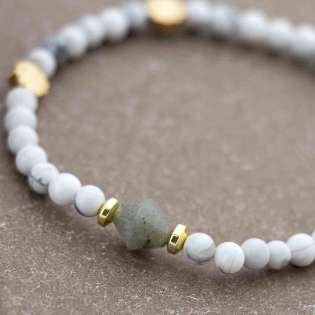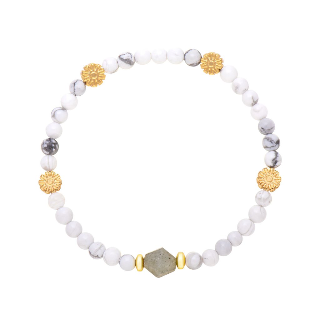 Stílusos karkötő apró howlit gyöngyökből, amely finom fehér árnyalatával és szürke erezettségével tiszta és elegáns hatást kelt. A közepét szabálytalanul csiszolt kő alkotja véletlenszerű színekben, a világostól a sötétebb árnyalatokig, sebészeti acélból készült fém alkatrészekkel kombinálva, arany színben. A rugalmas gumiszalagnak köszönhetően a karkötő könnyen alkalmazkodik a csuklóhoz, és kényelmes a mindennapi viselet.