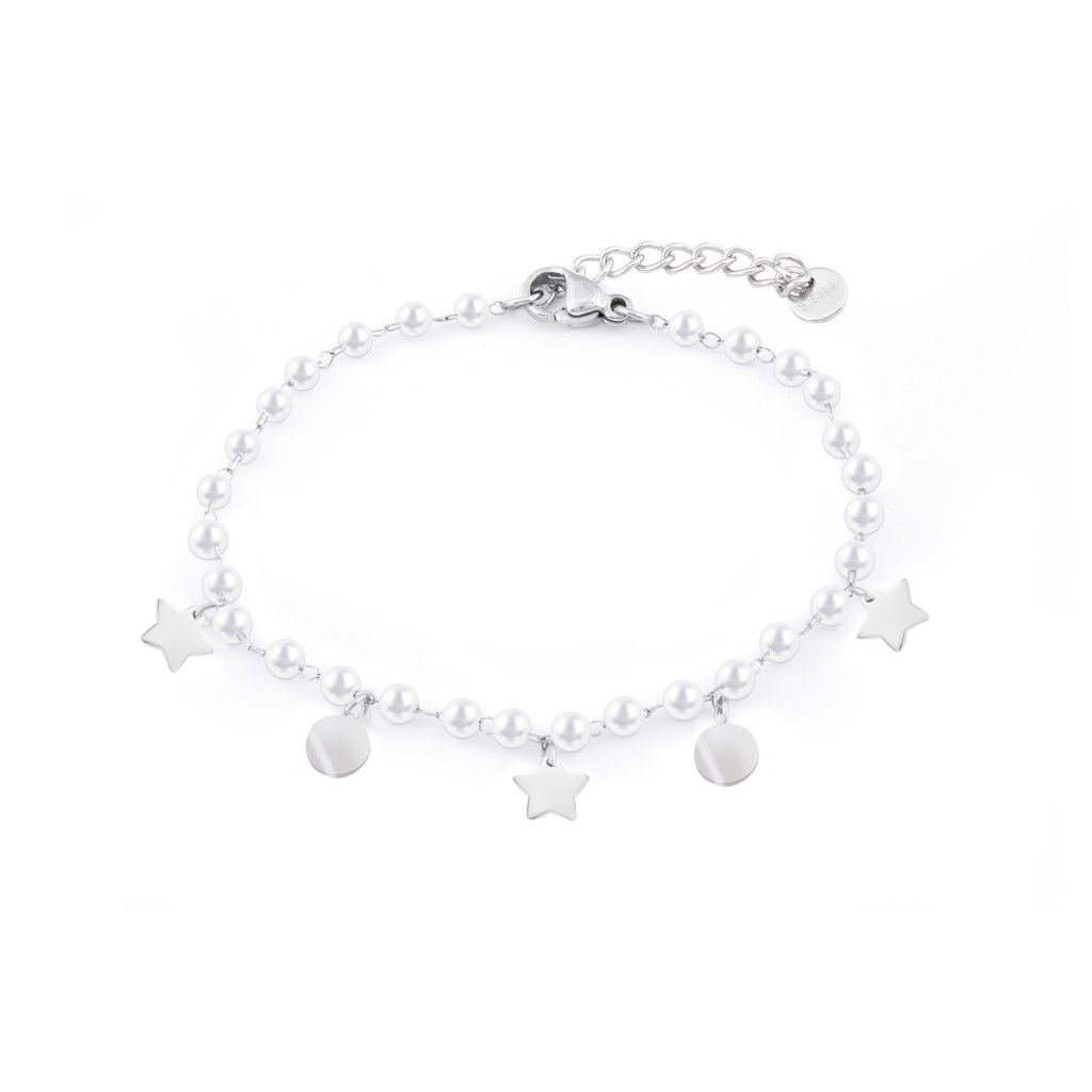 A finom, apró, szintetikus gyöngyökkel díszített karkötő, melyet elegáns, csillag és kör alakú függők ékesítenek, a romantika lágy érintését és a modern eleganciát hozza el. A gyöngyös design és a fényes fém részletek kombinációja harmonikus egészet alkot, amely feldobja bármelyik öltözéket.