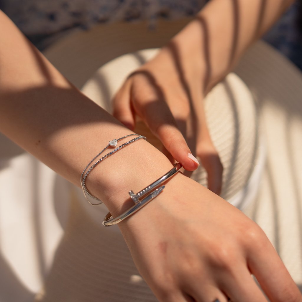 Minőségi rozsdamentes acél karkötő köröm alakban, kockacirkóniával , mindennapi viseletre alkalmas.
