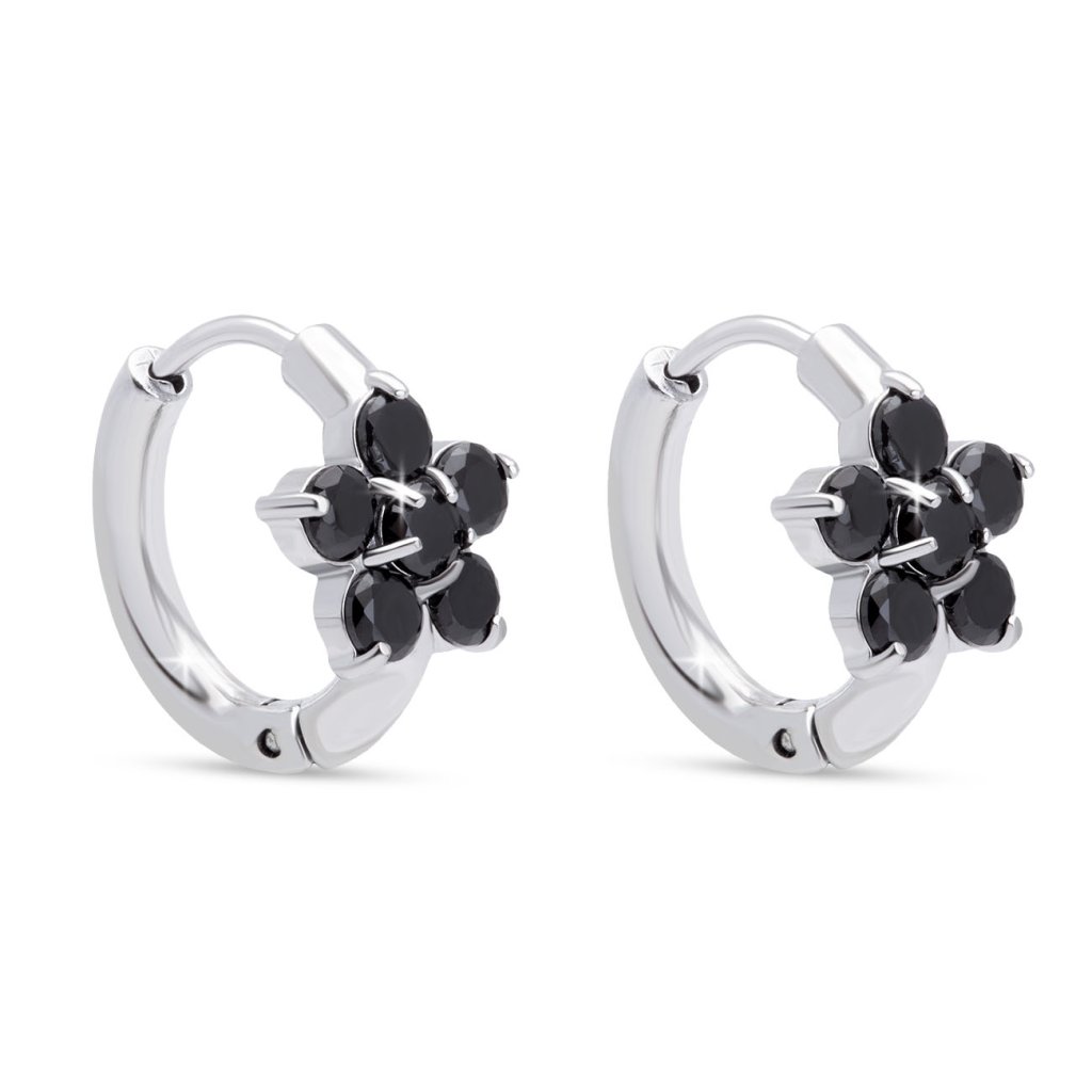 Az elegáns, virág alakban elrendezett fekete kövekkel díszített karika fülbevalók tökéletes egyensúlyt képviselnek a finomság és a hangsúlyos stílus között. Az acél fényes felülete a sötét részletekkel kombinálva kifinomult megjelenést kölcsönöz, amely minden alkalmat feldob.