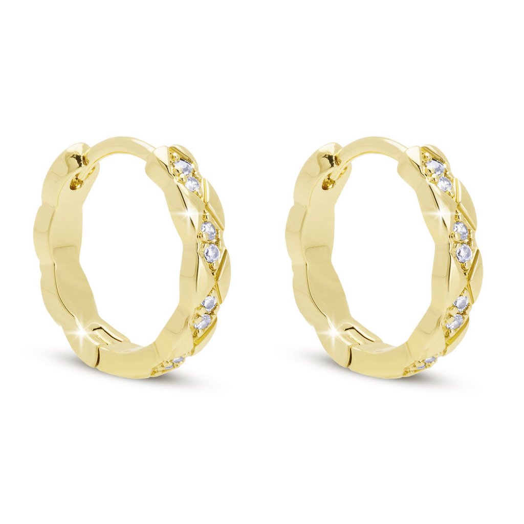Elegáns, kör alakú fülbevaló, modern, enyhén csavart profillal, finom, tiszta cirkónia kövekkel díszítve, amelyek diszkrét csillogást kölcsönöznek az egésznek. A felület 14 karátos arannyal van bevonva, ami kiemeli az ékszer luxus megjelenését. Ideális mindennapi viseletre és ünnepi alkalmakra – finom, ugyanakkor stílusos hatást kelt.
