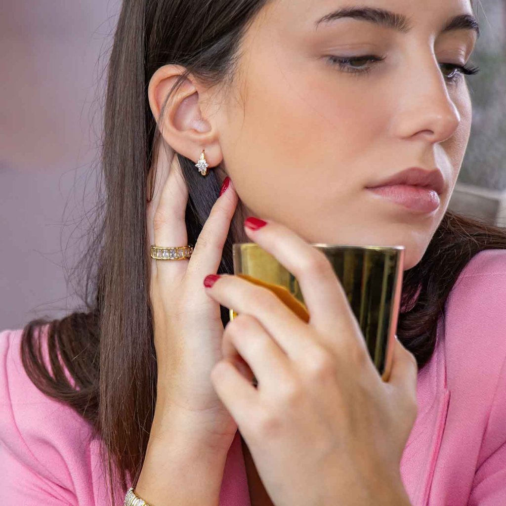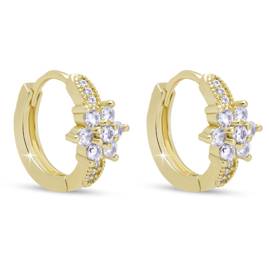 Ezek a finoman formázott, kör alakú fülbevalók virágmotívumukkal hívják fel magukra a figyelmet, melyet ragyogó cirkónia kövek alkotnak, kifinomult és bájos hatást keltve. Kisebb átmérőjüknek és biztonságos zárásuknak köszönhetően ideálisak mindennapi viseletre és ünnepi alkalmakra egyaránt.
