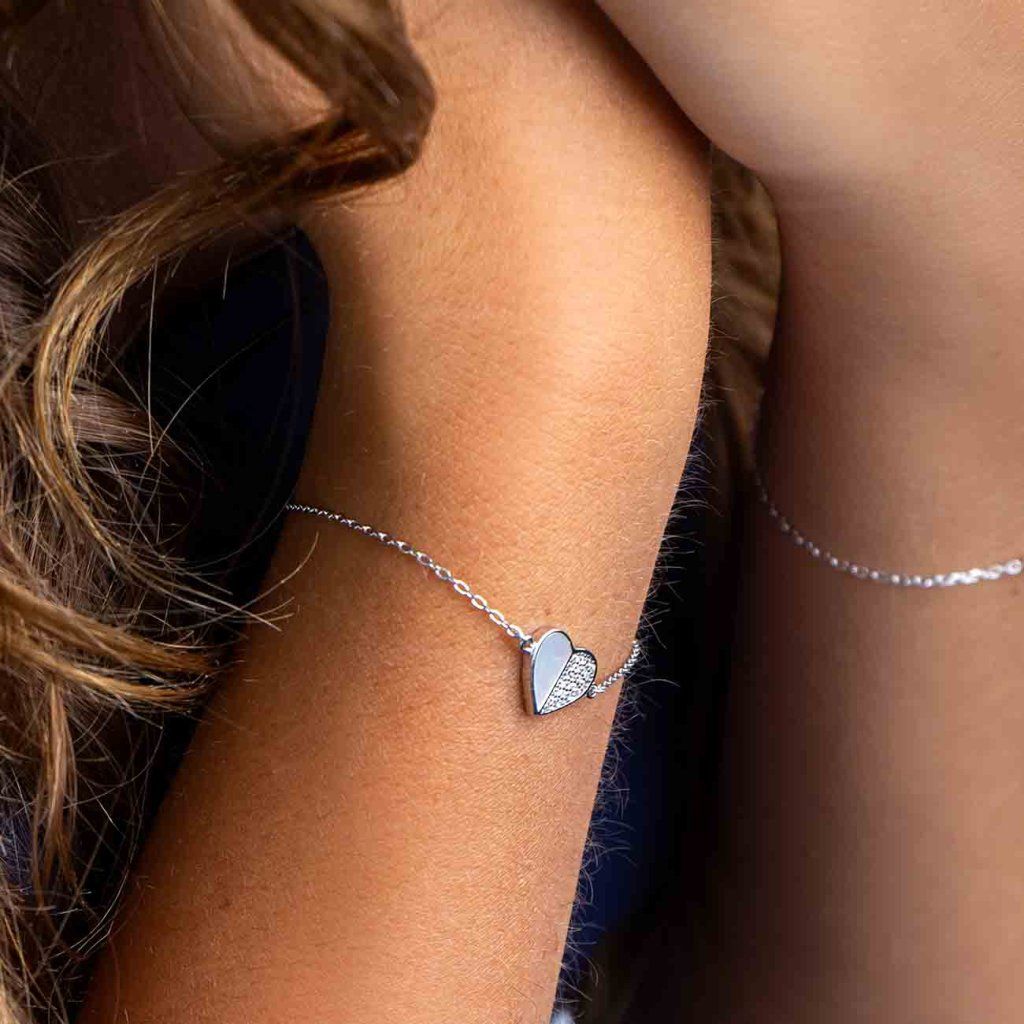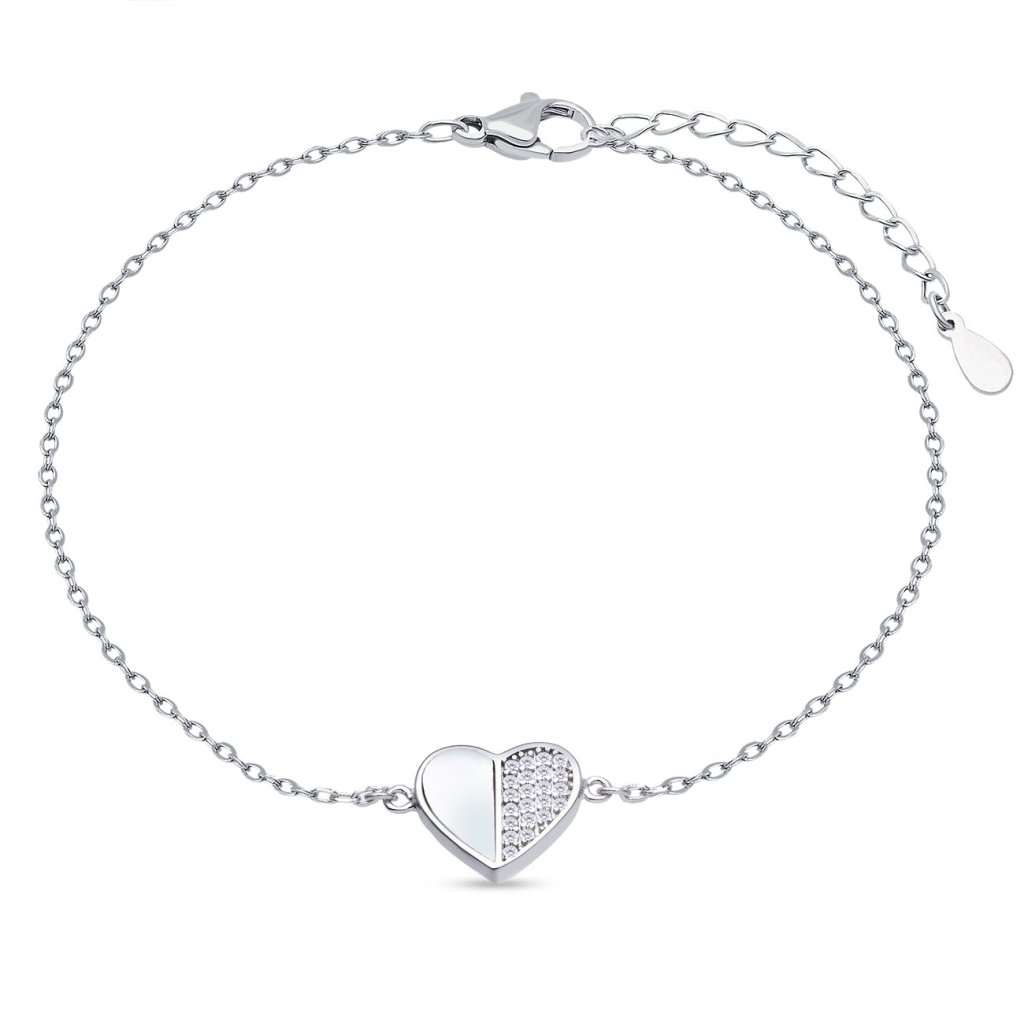 Ez a finom karkötő egy diszkrét, felezett szív motívumot hordoz – az egyik fele sima és tükörfényesre polírozott, a másik pedig csillogó cirkóniákkal van kirakva. Az ékszer a két különböző, mégis tökéletesen kiegészítő világ kapcsolatát szimbolizálja. Ideális ajándék a szeretett személynek, vagy a személyes jelentőség mindennapi emlékeztetőjeként. Finom kivitelezésének köszönhetően alkalmas mindennapi viseletre és ünnepi alkalmakra is.