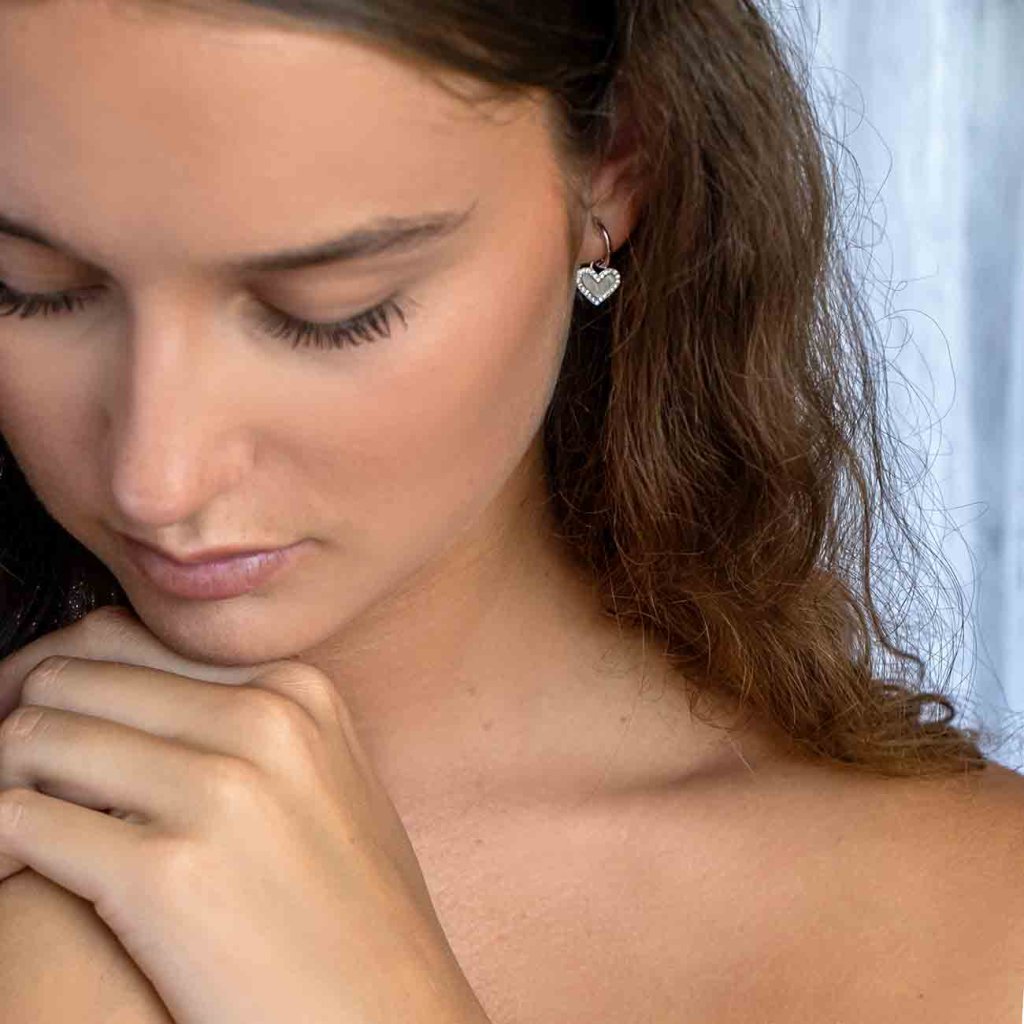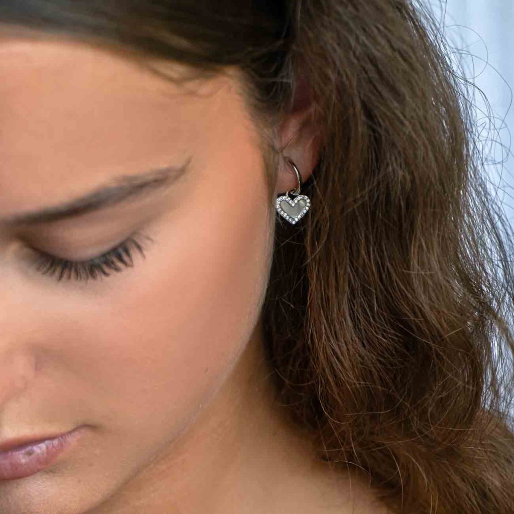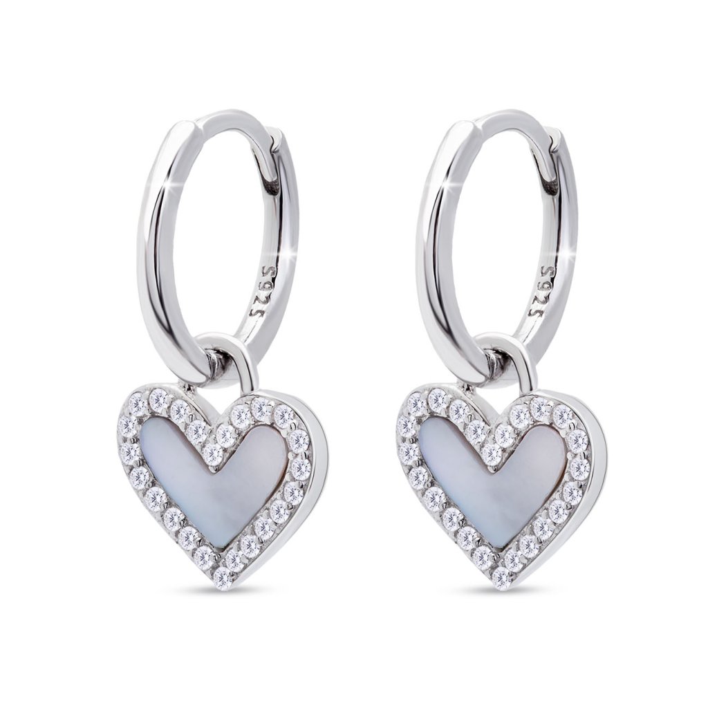 Ezek a bájos, szív alakú függő fülbevalók ötvözik a finomságot, a nőiességet és a ragyogó fényt. A szív természetes gyöngyházzal van kitöltve, amely kifinomult megjelenést kölcsönöz az ékszernek, és apró, tiszta cirkóniákkal van körülvéve, amelyek gyönyörűen csillognak minden mozdulatnál. A biztonságos, rápattintható zárásnak köszönhetően kényelmes viselet, és alkalmas mindennapi öltözékhez és különleges alkalmakra is.