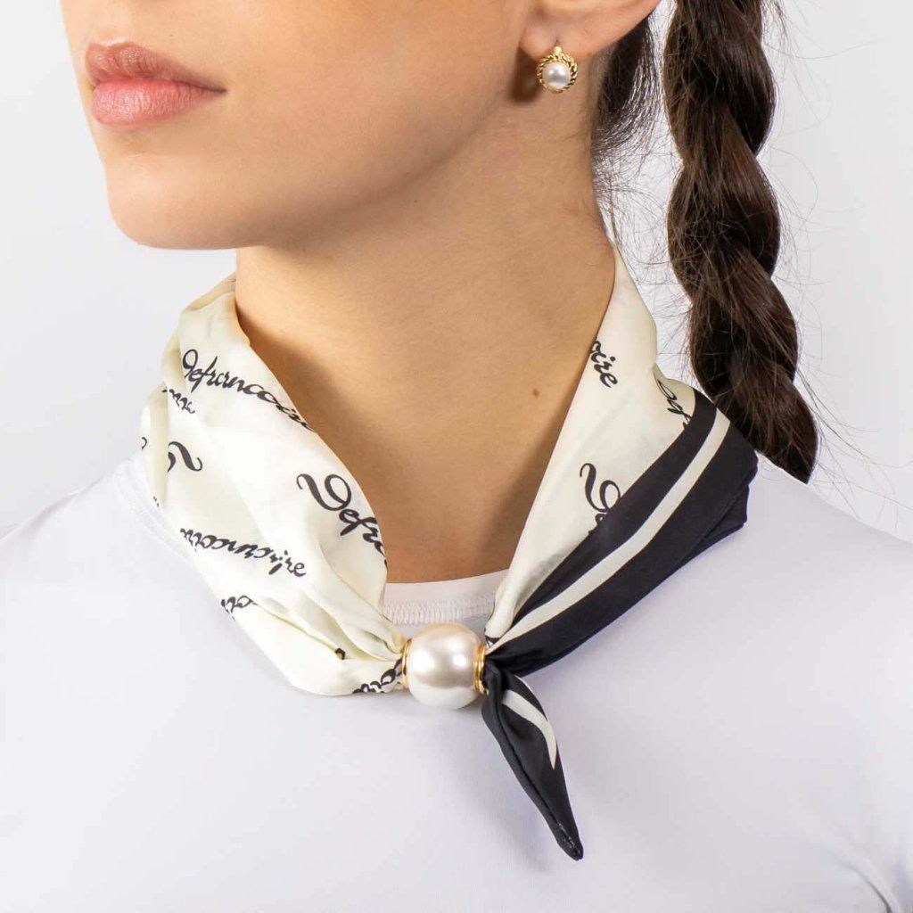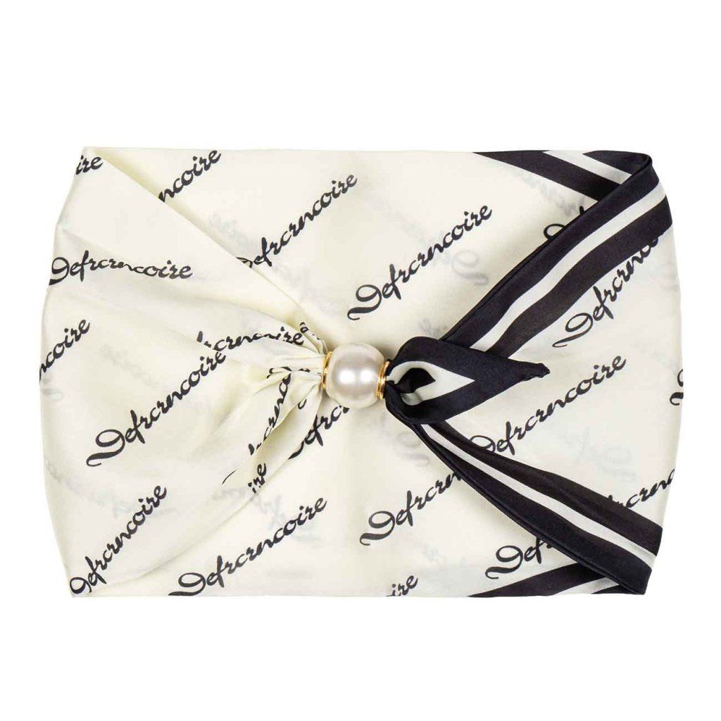 A csillogó selyemsál finom feliratmintával időtlen és mégis eredeti. A világos háttér és az erős vonalak kontrasztja precíz és kifinomult megjelenést kölcsönöz az egésznek. A gyöngyház mágneses csat pedig stílusos részletre emeli az egész kiegészítőt, amely első pillantásra megragadja a figyelmet.