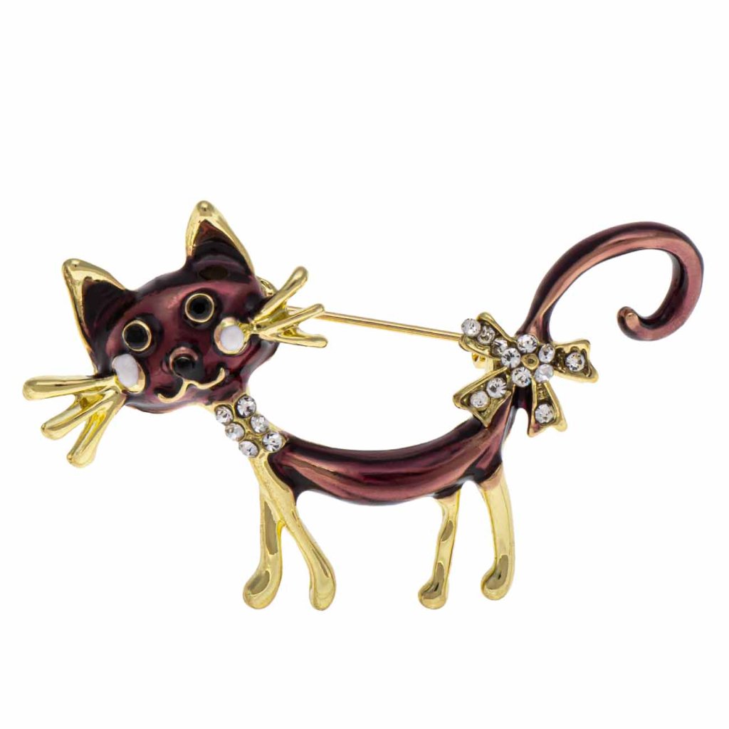 Játékos bross egy megnyúlt cica formájában bordó zománccal, arany részletekkel és csillogó kövekkel a nyakán és a farkán. Stílusos kiegészítő egy csipetnyi luxussal, amely minden kabátot, zakót és kendőt feldob.