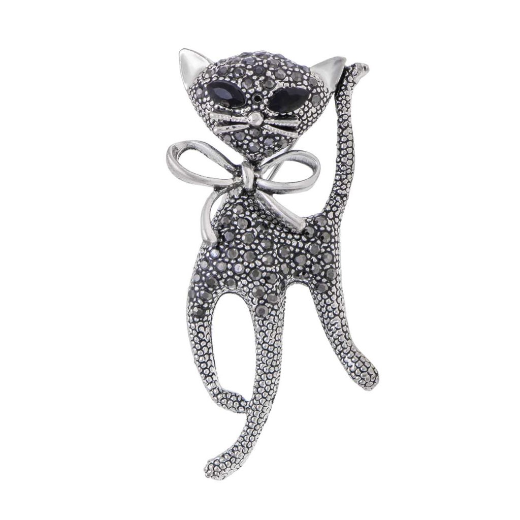 Stílusos macska alakú bross finom cirkóniákkal díszítve, elegáns ezüst tónusban, amelyek visszafogott, mégis kifejező hatást keltenek. Tiszta vonalak, a nyakán masnival és precíz kidolgozással rendelkezik a bross, ékszer jellegét kölcsönözve neki. Remekül kiegészíti a kabátot, zakót és ruhát, és örömet okoz mindenkinek, aki szereti az elegánsan megfogalmazott állati motívumokat.