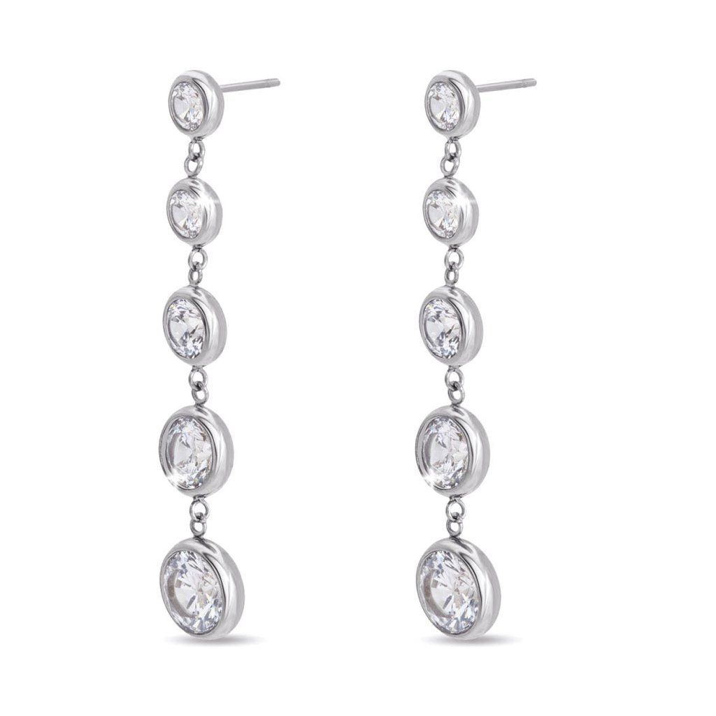Ezek a feltűnő fülbevalók finom, mégis észrevehető csillogással ragyogtatják fel arcát. A precíz vonalak és a fokozatosan növekvő cirkóniák időtlen eleganciahatást keltenek, amely minden alkalommal hangsúlyozza nőiességedet. Ideális választás azokhoz a pillanatokhoz, amikor könnyedséggel és ízléssel szeretnél ragyogni.