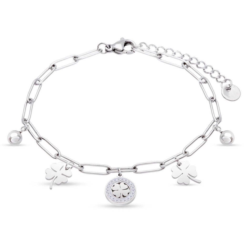 Elbűvölő karkötő, hangsúlyosabb szemes lánccal, négylevelű lóhere alakú charmokkal, köves kerek medállal és fényes golyókkal díszítve. A szerencse szimbolikájának és az elegáns fénynek a kombinációja tökéletes kiegészítővé teszi a mindennapokra, és jelentőségteljes ajándékként is ideális.