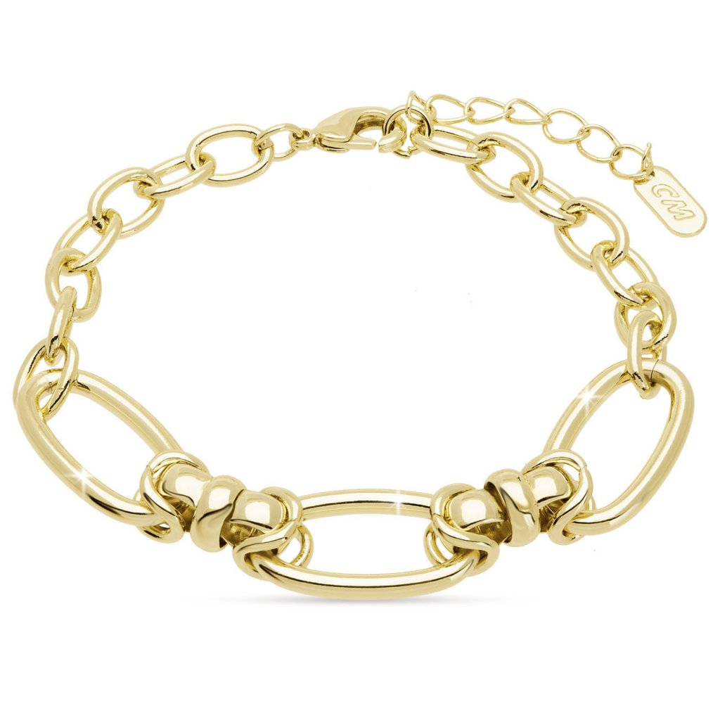 A modern, nagyobb, ovális szemekből álló, fényes arany kivitelű karkötő stílusos kiegészítő minden alkalomra. A különböző méretű szemek és díszítő gyűrűk kombinációja kifejező struktúrát kölcsönöz az ékszernek anélkül, hogy túlzottan masszív hatást keltene. A minőségi, 14 karátos arannyal bevont felület elegáns megjelenést és tartós fényt biztosít.