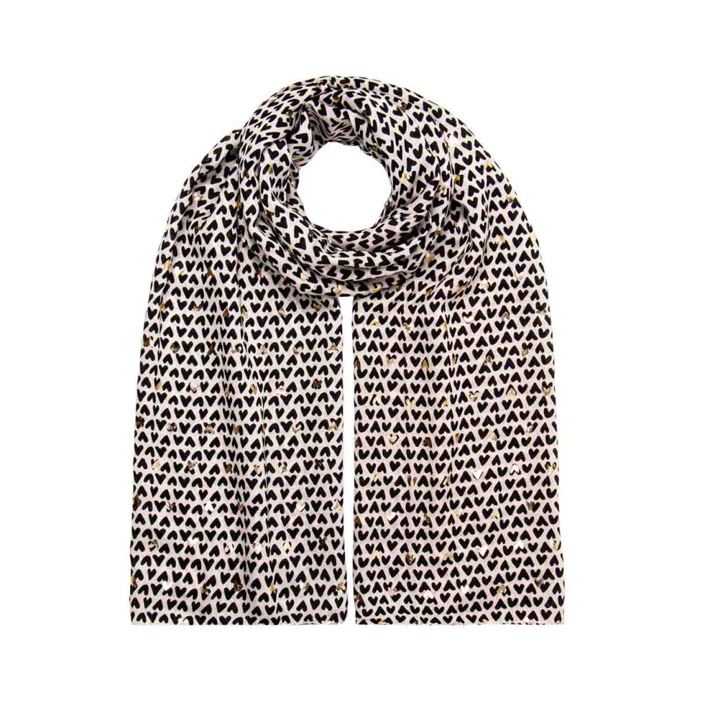 A stílusos, téglalap alakú, apró szívecske motívummal díszített kendő kontrasztos fekete-fehér kombinációban játékos és mégis elegáns hatást kelt. A viszkóz és a pamut kombinációjának köszönhetően könnyű, puha tapintású és kellemesen légáteresztő. Könnyen alkalmazkodik, és szabadon viselheti a vállán, a nyaka köré kötve vagy divatos kiegészítőként a táskáján. Univerzális színeinek köszönhetően illik a mindennapi öltözethez és az elegánsabb stílushoz is.