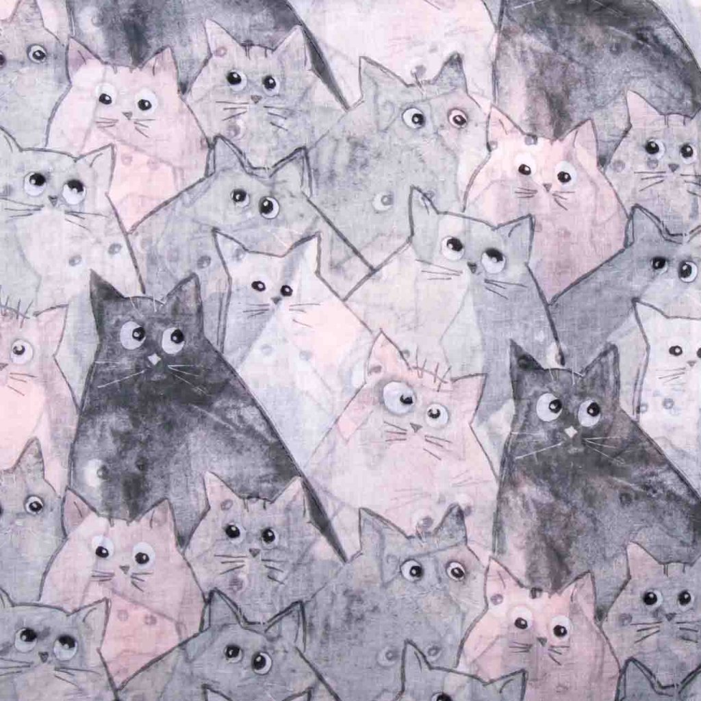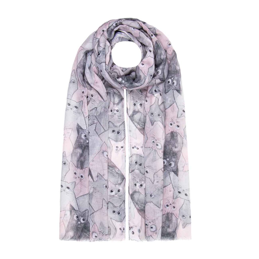 Dobja fel öltözékét egy játékos sállal, melyet aranyos macskák eredeti motívuma díszít. A szürke és rózsaszín árnyalatok finom kombinációja elegáns, ugyanakkor könnyed hatást kelt. A sál elég hosszú és széles ahhoz, hogy sokféleképpen viselhesse – lazán átvetve, a nyaka köré tekerve vagy könnyű vállkendőként.