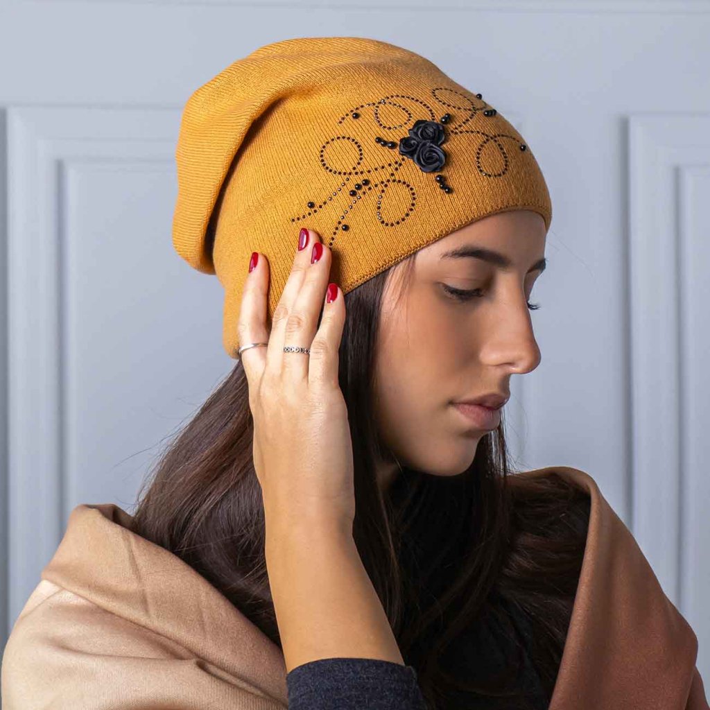 Női kötött sapka rózsákkal és kövekkel, mustársárga 7100374-5