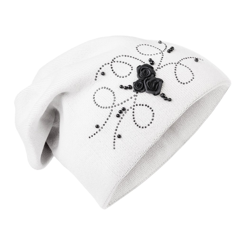 Női kötött sapka rózsákkal és strasszkövekkel, fehér színben