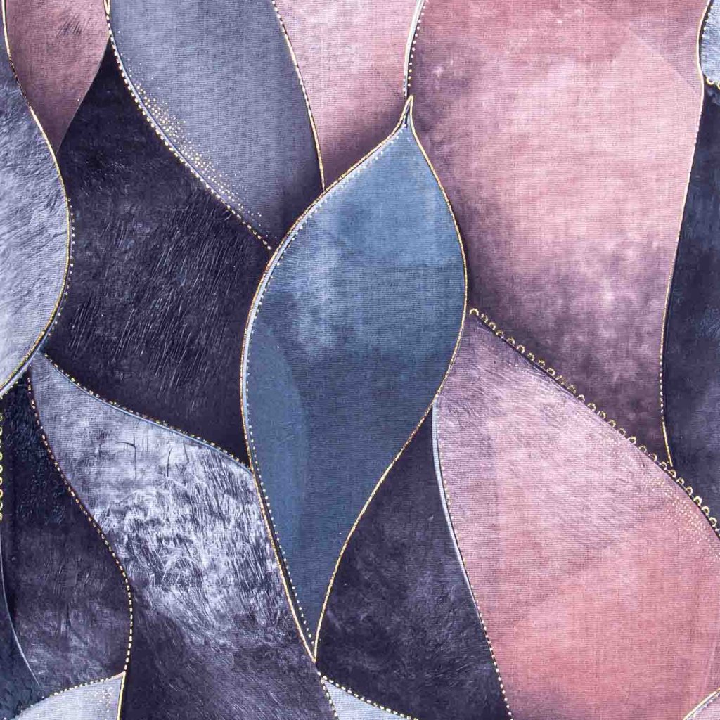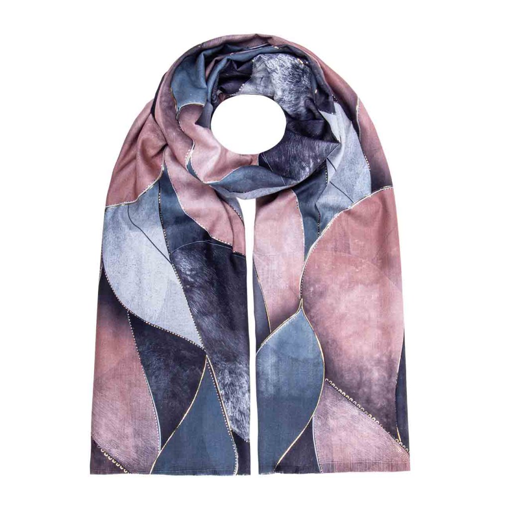 Az elegáns, absztrakt mintázatú, rózsaszín, kék és szürke tónusú sál kifinomult és eredeti hatást kelt. A finom aranynyomat luxusos hangsúlyt kölcsönöz.